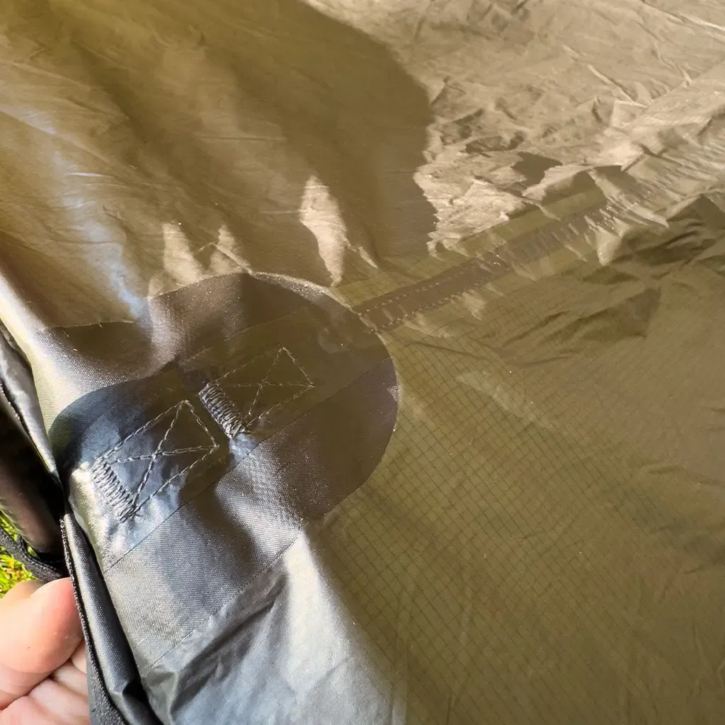 The tent's rainfly is made from 15D nylon (weight 40 g/m², water column 5 000 mm), which keeps it lightweight while offering good tensile strength. The material also has high resistance to tearing and UV radiation. The waterproofing of the tent is ensured by a combination of silicone and PU coating, without the use of PFOS, FPOA, DWR, fluorinated substances, toxic metals, and aldehydes.