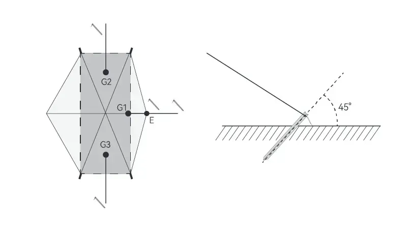 Step 3: Pull point E outwards and secure it with a stake. Tension the lines from anchor points G1, G2, and G3, and secure them with stakes.