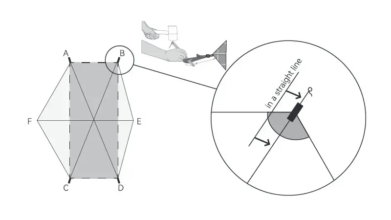 Step 1: Stake down the four corner stakes (A, B, C, D) to form an exact rectangle. Align the corner guy lines in a straight line with the ridge seams of the tent to make the structure more stable.