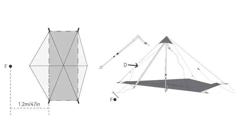 Step 2: Hammer in stake F about 1,2 m away from the inner tent. Use a trekking pole that’s 120–125 cm long to create the support structure. Tauten the vestibule by attaching the guy line to stake F.