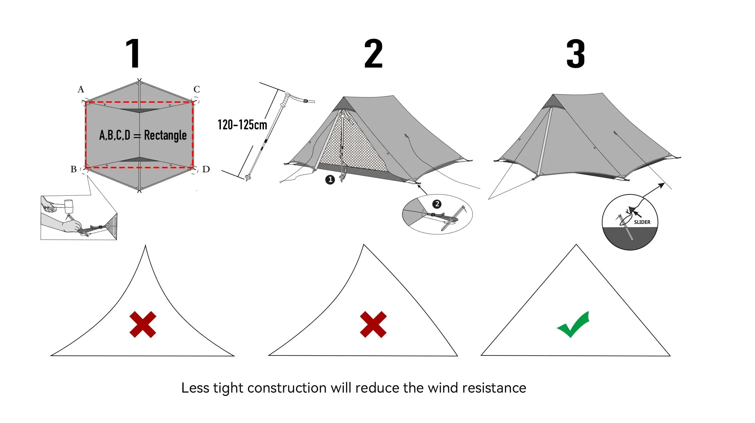 Step 2: Set the trekking poles to a height of 120-125 cm and insert them into the tops above the doors of the tent. Tension and stake down the cords that lead from the vents.