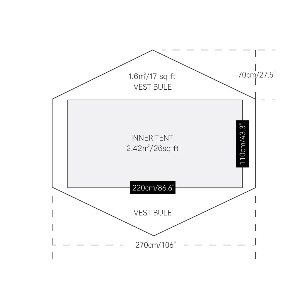 The tent is spacious enough for 2 people, even if you're taller (inner dimensions 220 x 110 cm, height 125 cm). If you want to save some grams and plan to use the tent solo, check out the tent Lanshan for 1 person.