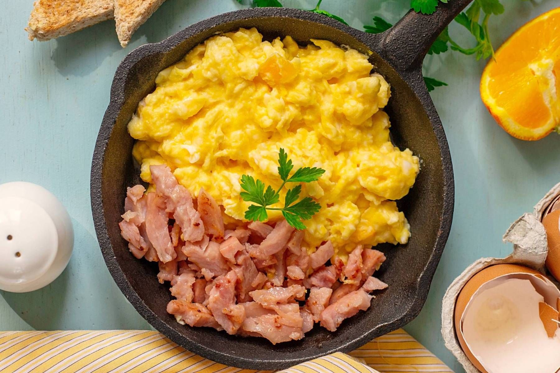 There’s nothing like a proper breakfast! Enjoy hearty scrambled eggs fried with red onions and ham, softened with cream and sprinkled with Gouda cheese.