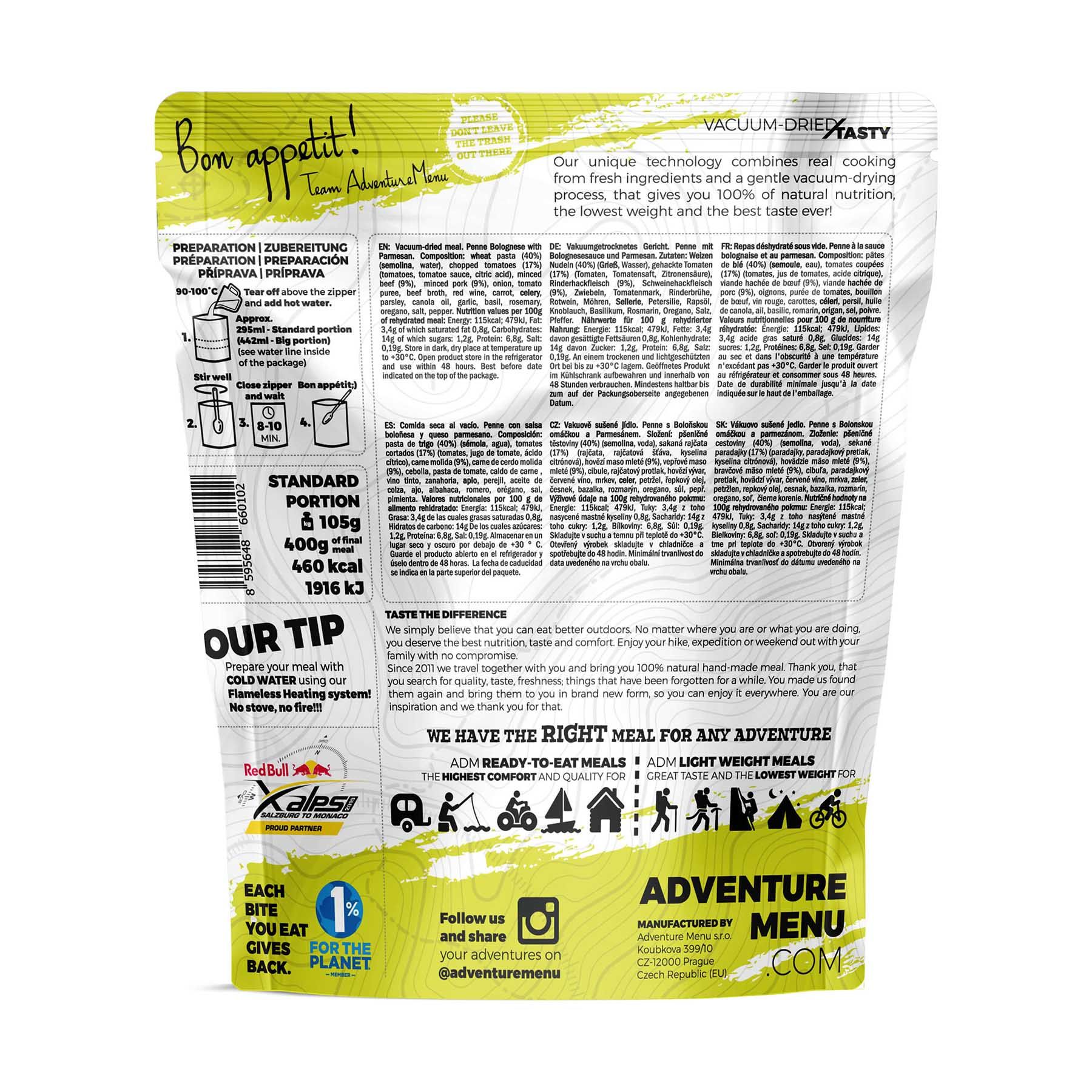 These meals are designed to be carried in your backpack. They weigh almost nothing yet provide everything your body and mind need after a demanding day. All Adventure Menu meals are 100% natural, free from any chemical additives, and handmade in the Czech Republic.