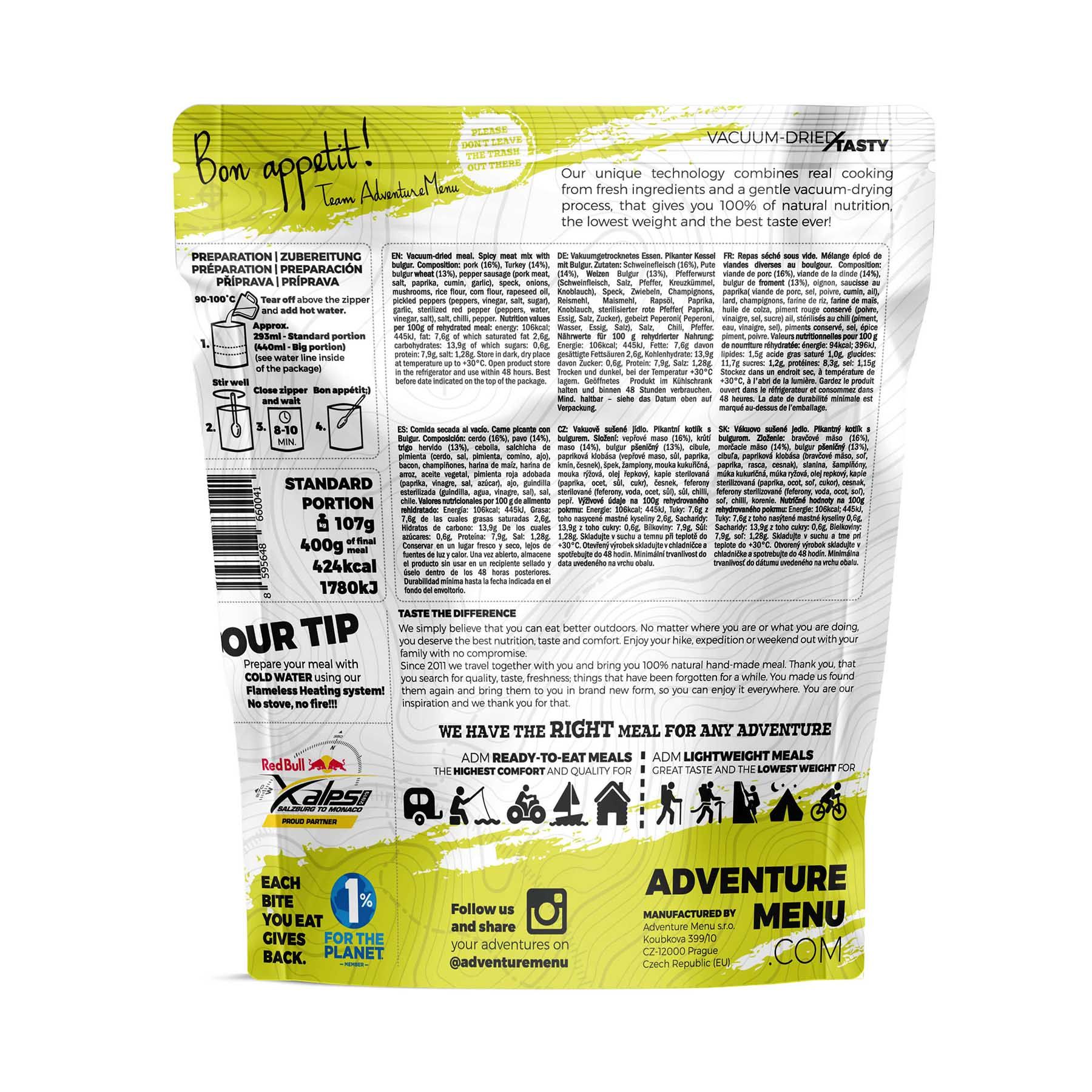 These meals are designed to be carried in your backpack. They weigh almost nothing yet provide everything your body and mind need after a demanding day. All Adventure Menu meals are 100% natural, free from any chemical additives, and handmade in the Czech Republic.