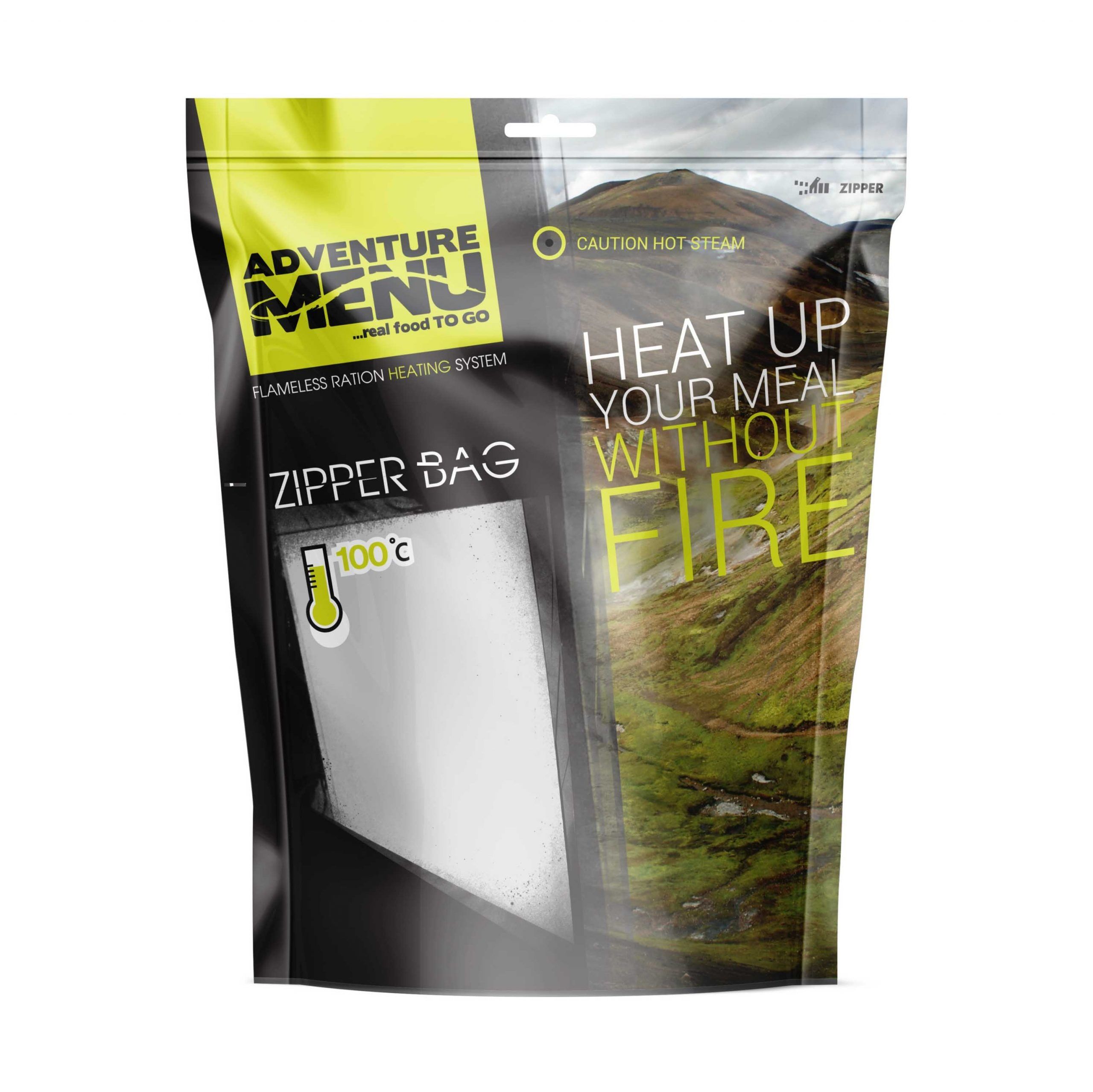 If you want to save more grams and space in your backpack by leaving your stove and cookware at home while still enjoying tasty and warm meals, the self-heating system is just for you. To heat your food, you need a flameless-heater (sold separately) and a Zipper-bag.