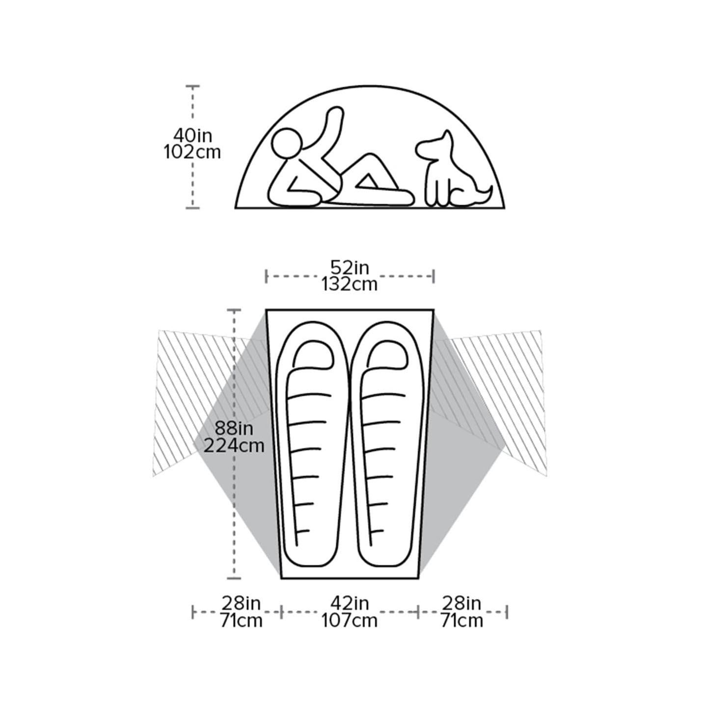 The tent has 2 side entrances with 2 spacious vestibules. Both sleepers have their own entrance and enough space for gear. All zippers have two sliders and are fitted with ergonomic pulls. The rainfly features zippers protected by a storm flap with Velcro. Reflective guy lines will make setup easier for you both day and night.