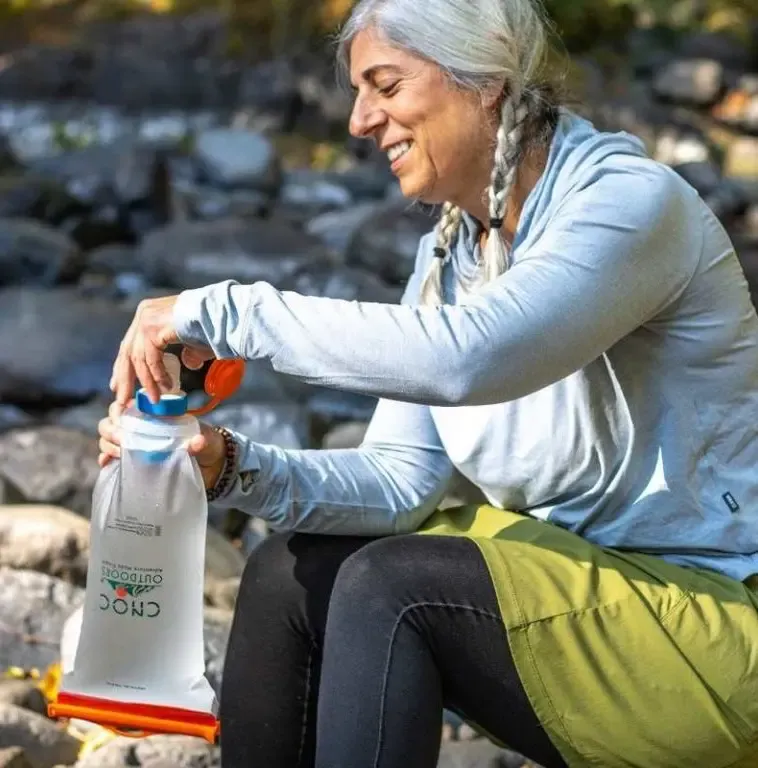 The CNOC Vecto bottle is a great addition to Katadyn filters. You can easily screw Katadyn BeFree filters onto its 42 mm threaded neck and all variations of filters according to the volume of the original bottle. The bottle has a double opening. With the wide opening on the other side, you can easily scoop water from a shallow source in no time. When filtering, you can squeeze the bottle, and unlike classic PET bottles, it won't deform at all. You can easily clean the bottle.
