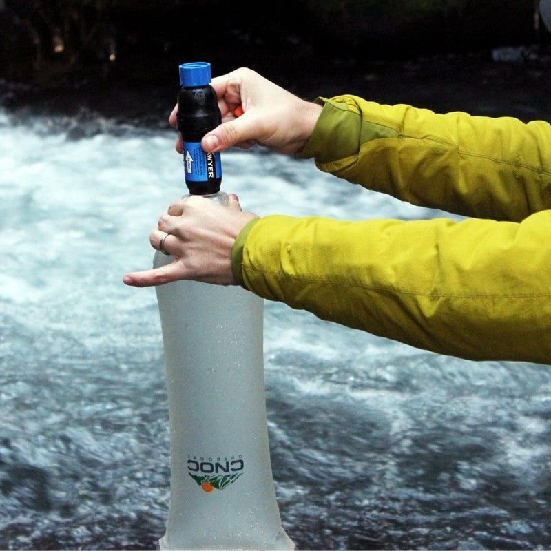 The CNOC Vecto bottle is a great complement to Sawyer filters. Its 28 mm thread easily fits Sawyer Squeeze, Micro Squeeze a Mini filters. The wide opening allows you to quickly collect water even from shallow sources. When filtering, you can squeeze the bottle without it deforming like standard PET bottles. The bottle is also easy to clean.