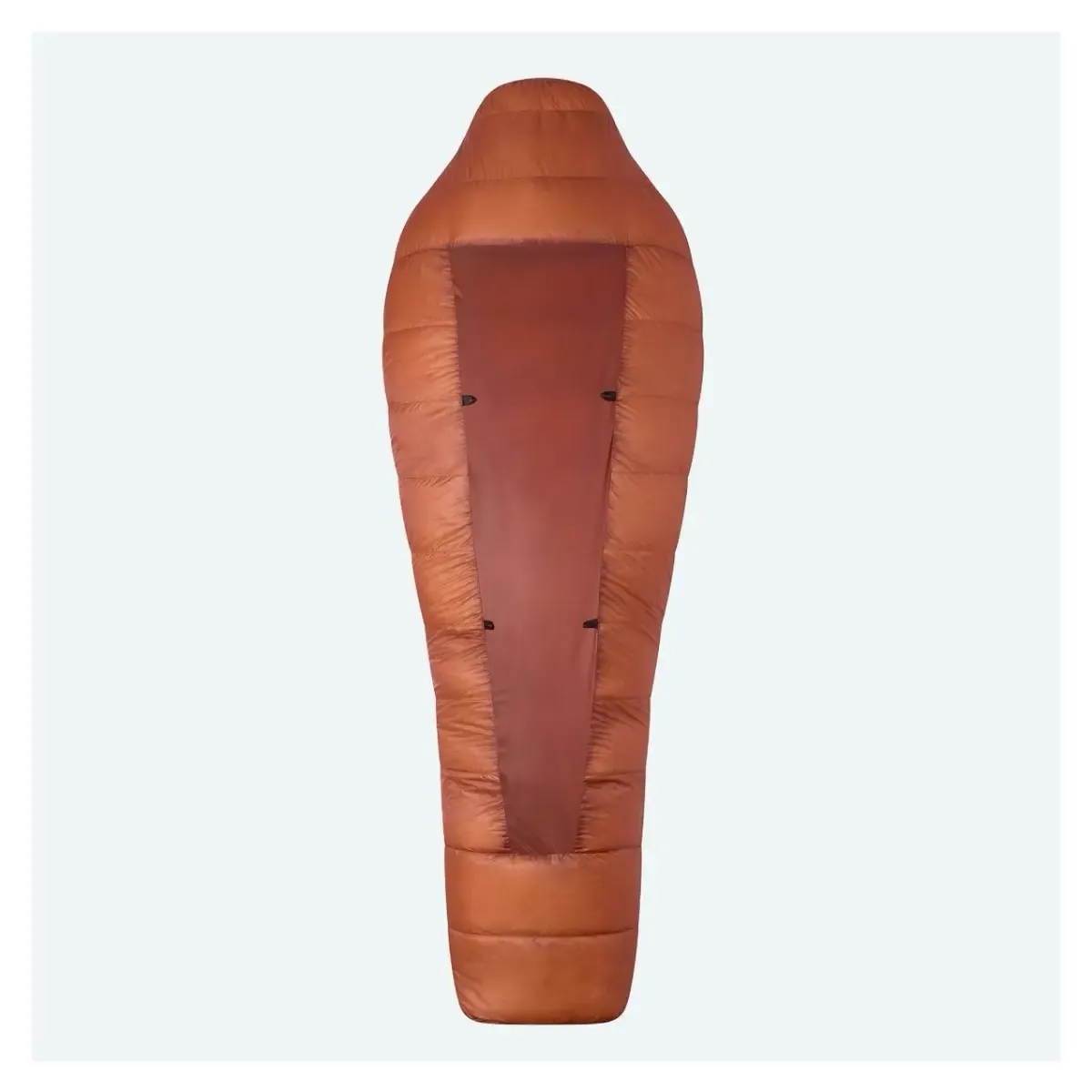 Extremely lightweight and innovative sleeping bag that combines the benefits of a classic sleeping bag and a quilt. The back section is made up of just one layer of fabric without down insulation, and the sleeping bag easily attaches to your sleeping pad. It's the perfect choice for long-distance treks, weekend crossings, bikepacking, long trail running races, and other adventures in summer conditions or during warmer spring and fall nights.