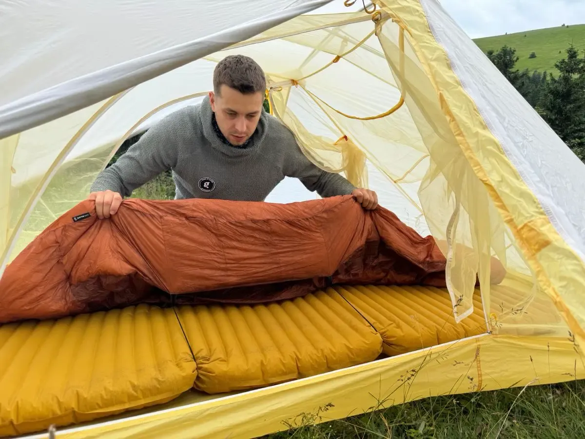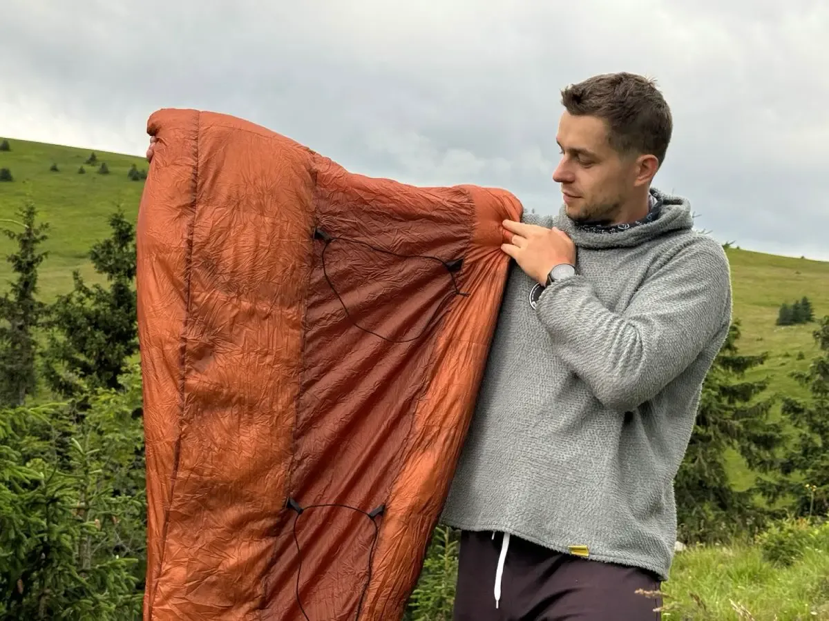 Cumulus Aerial 250 has a hybrid design that combines the benefits of a traditional sleeping bag and a quilt. Aerial features a classic mummy shape of a closed sleeping bag without a zipper, but the back is stripped of down insulation and consists only of a single layer of Toray Airtastic fabric. Just like with a quilt, there’s no down on the back because compressed down loses loft, doesn’t insulate, and is practically pointless. You’re insulated from the ground by your sleeping pad, but unlike a quilt, you don’t actually touch it directly.