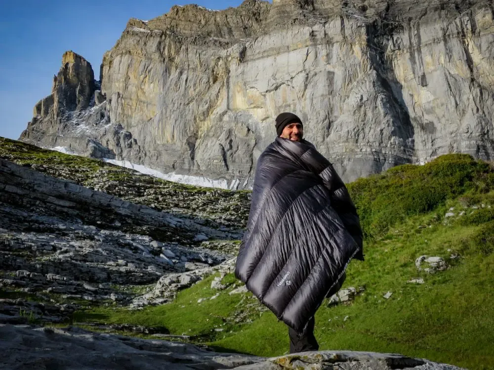 The blanket has a rectangular shape and an H-chamber construction with continuous chambers that evenly distribute the down. In quilt mode, you can open the blanket in the foot area to vent it. Thanks to the drawstring at the ends, the loops on the sides, and the elastic cord, you can easily attach it to your sleeping pad.