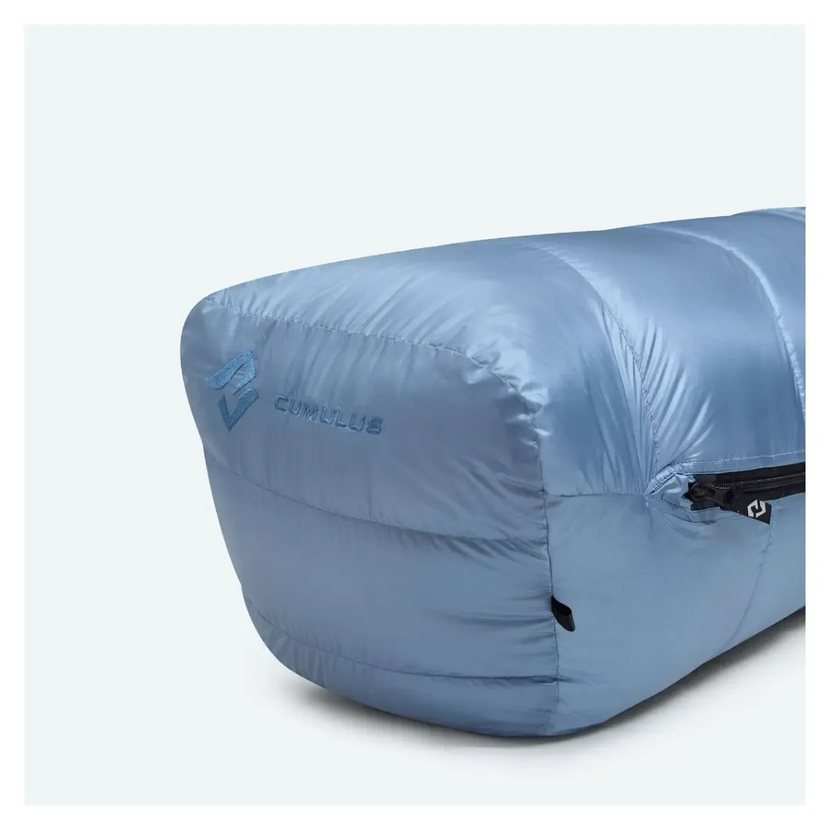 The sleeping bag features a 175 cm long YKK zipper with an extended slider to prevent it from snagging on the fabric during zipping. At the foot area, you'll find a second slider, which is ideal for ventilation. Behind the zipper on the inner side, there is a down-filled insulating tube that minimizes heat loss through the zipper itself. Two Cumulus sleeping bags with opposite zippers (left + right) can be connected together.