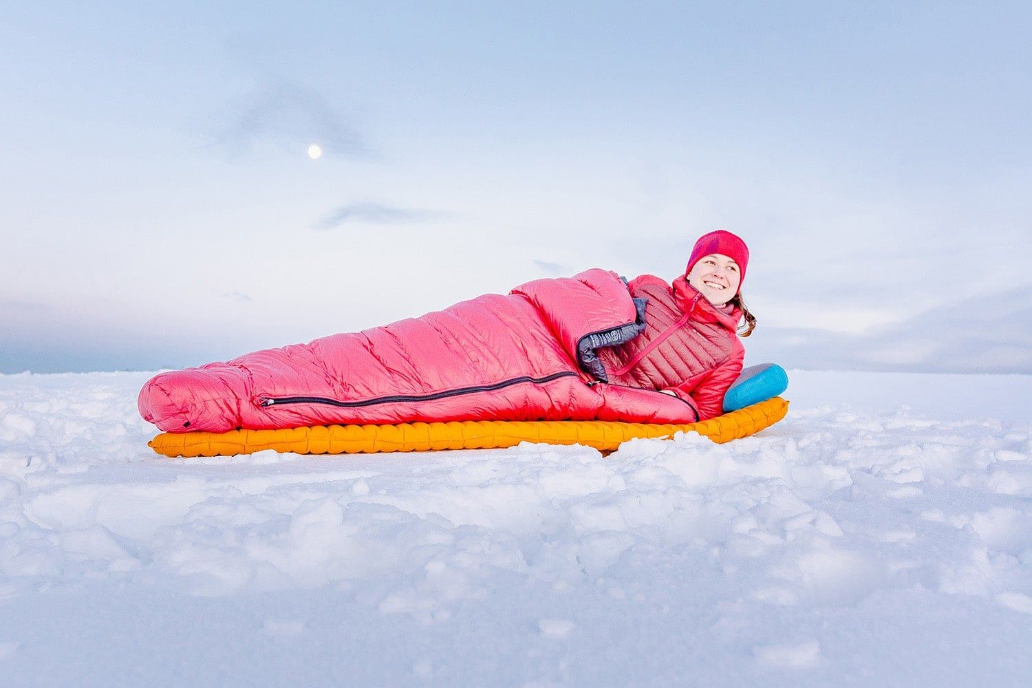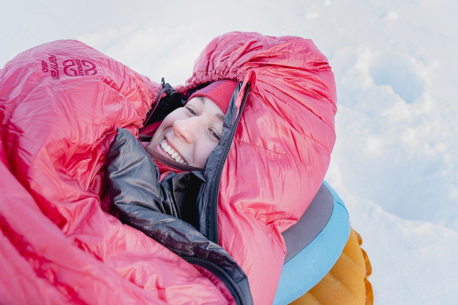 For easy orientation, the tightening of the hood and collar is different; you pull the hood with a flat strap and the collar with an elastic band. The sleeping bag has a separate down-filled collar that wraps around your neck on both sides and prevents heat loss through the hood. Inside the sleeping bag, there is a mesh pocket for a mobile phone, earplugs, or other small items.