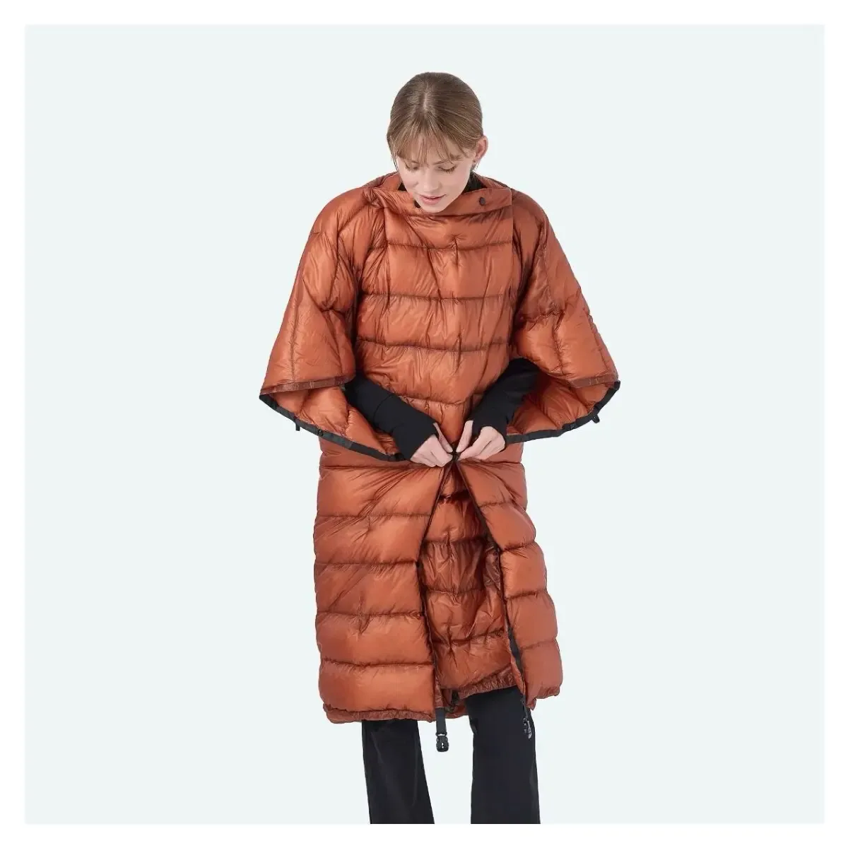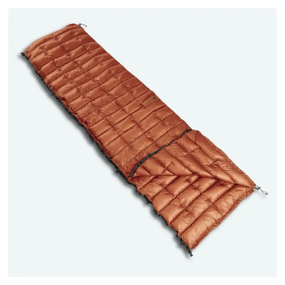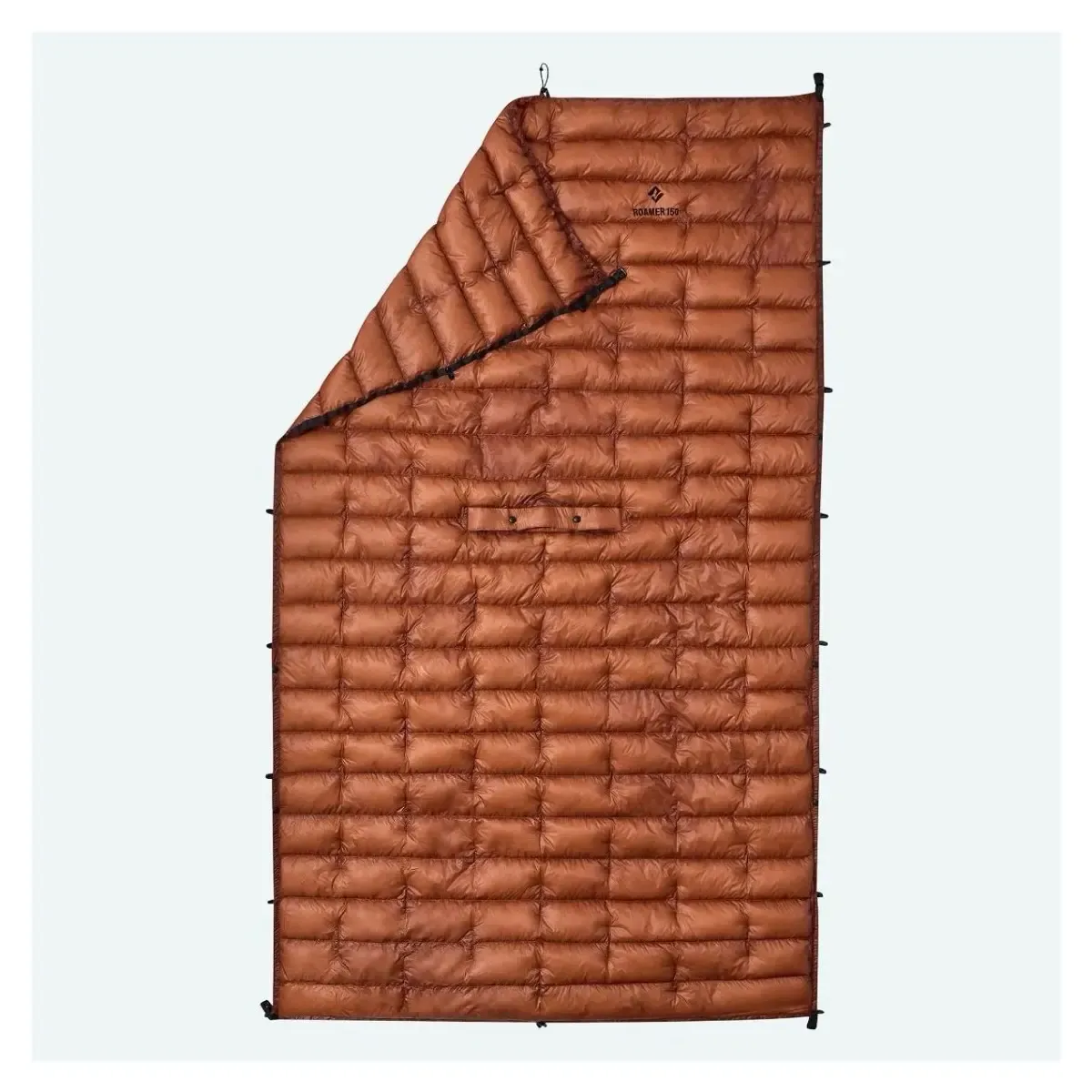 Roamer 150 has a rectangular shape and a quilted construction with continuous baffles that keep the down evenly distributed. The center opening for your head lets you use it as a poncho. In quilt mode, you can open up the foot area to ventilate. Easy attachment to your sleeping pad is secured with elastic straps or snap compatibility.