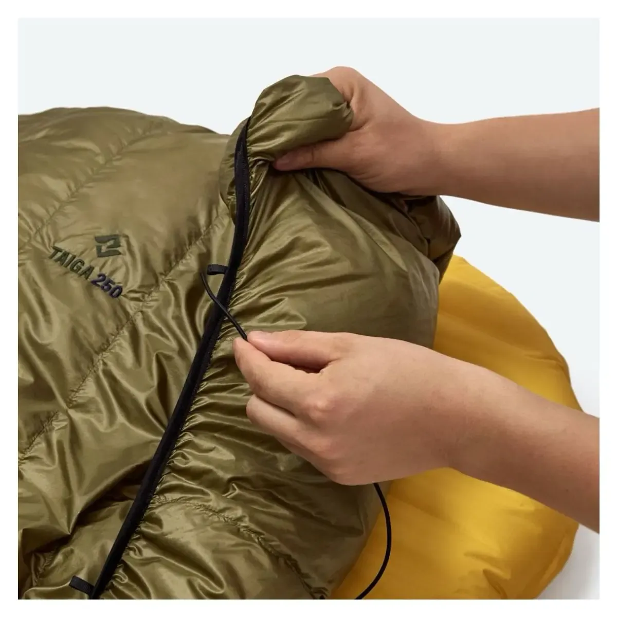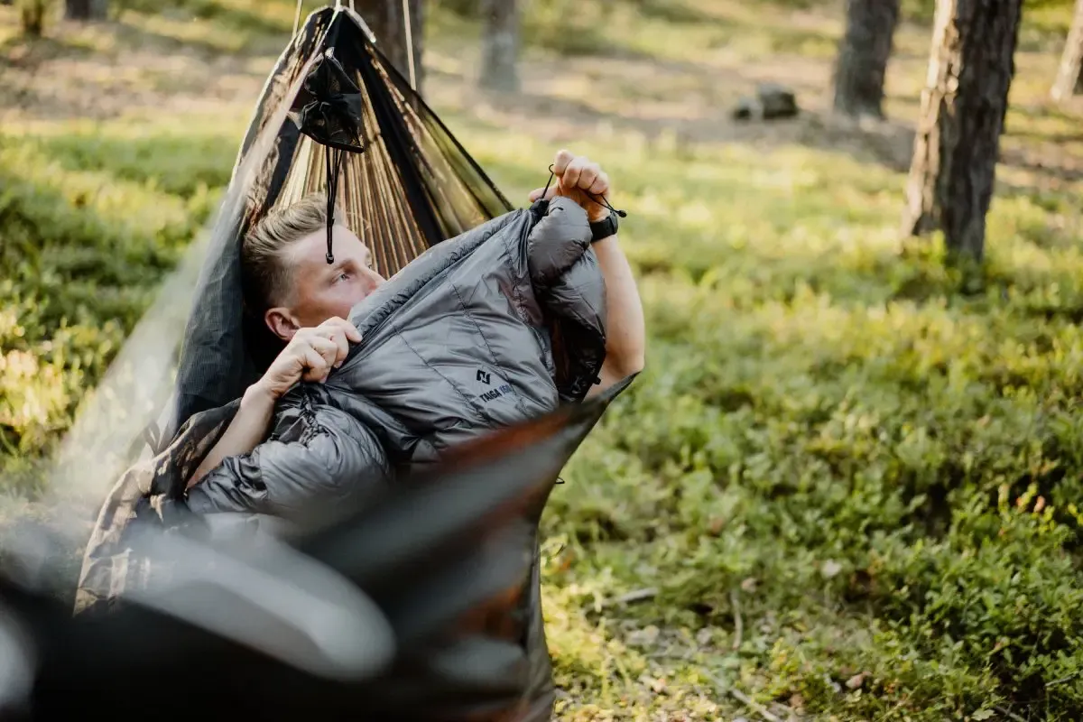The Taiga 250 is an open blanket without a zipper with a closed footbox, also known as a topquilt. Topquilts are primarily designed for comfy sleeping in a hammock, but you can also use them as classic quilts while sleeping on the ground on a sleeping pad without any issues. When sleeping in a hammock, an underquilt provides insulation from below, while when sleeping on the ground, the sleeping pad takes over that function.