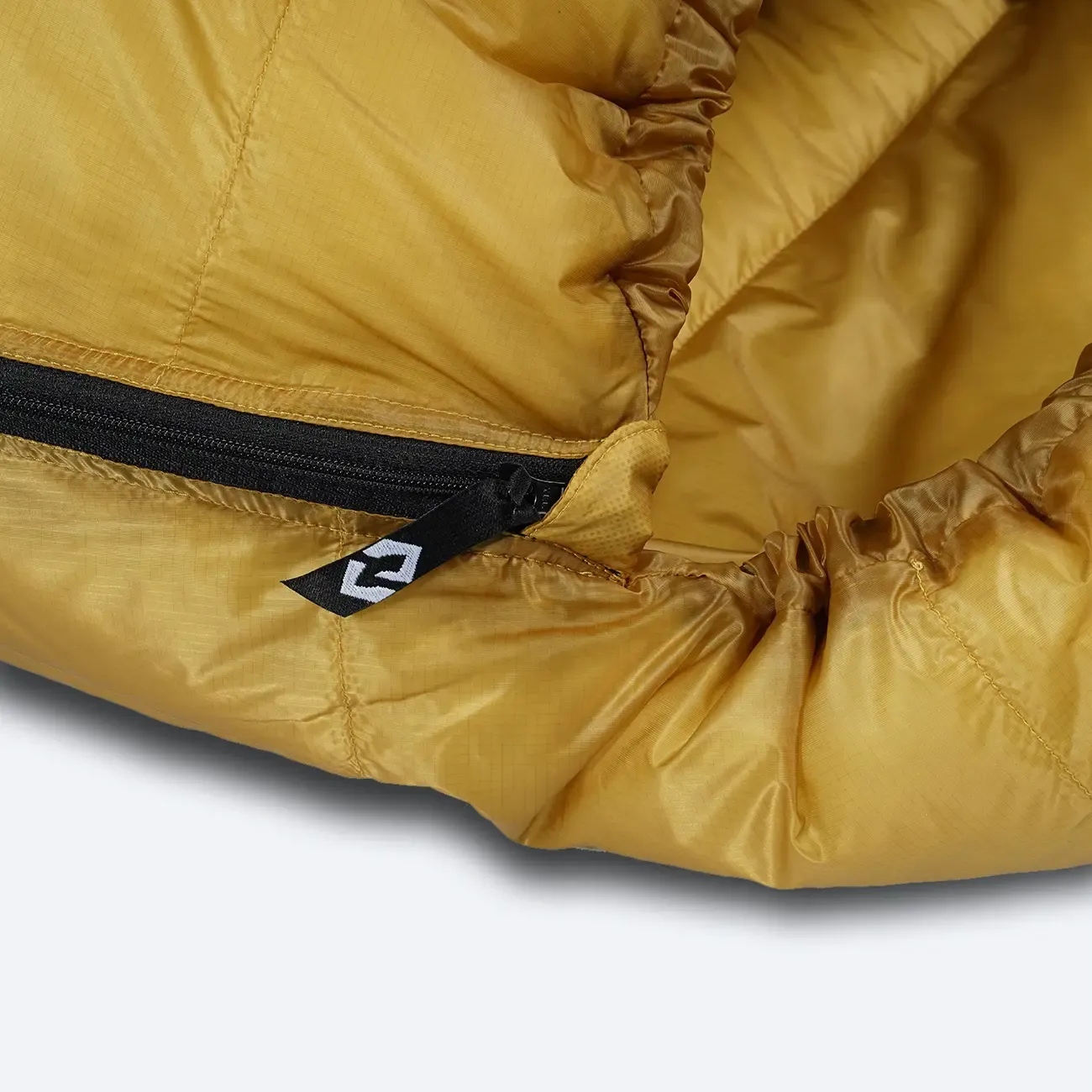 The body of the sleeping bag is made from an ultralight and packable fabric, Toray Airtastic 19 g/m². It is one of the lightest fabrics in the world, which does not allow down to escape and has sufficient durability for use in sleeping bags. It is well breathable, windproof, and very pleasant to the touch. The outer side of the fabric is treated with a durable water-repellent (DWR) coating that traps light condensation or a few drops of water. Thanks to the shade of the fabric used, you can even see through the sleeping bag.