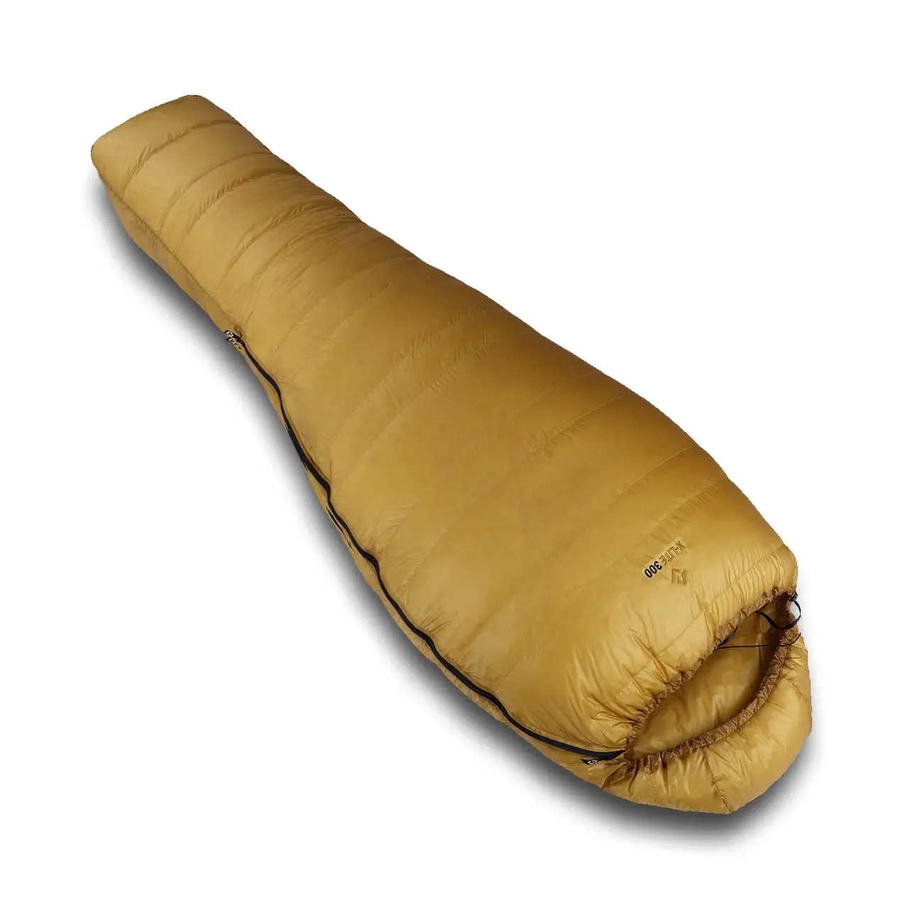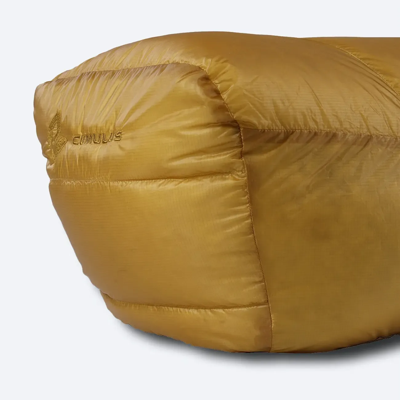 The filling consists of 300 grams of goose down with a fill power of 900 cuin! The ratio of down to small feathers is 95/5. The upper chambers are separated from the lower ones and are filled with slightly more down. The down is distributed in a ratio of 55/45. The weight of the sleeping bag's construction without down is a mere 165 grams, making the total weight 465 grams.