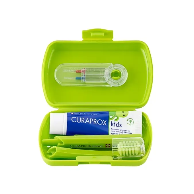 Travel set KIDS from the Swiss company Curaprox is an ultralight and compact travel set for kids' dental hygiene. It contains everything you need for daily care of children's teeth and gums. Thanks to its practical packaging, it fits into smaller pockets too. The whole set weighs just 65 grams. Every little traveler will love the solid-color packaging with a cute sticker inside!