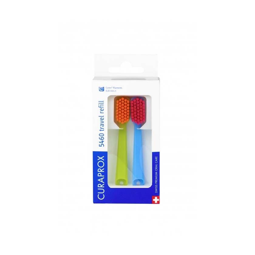 Replacement brush heads for the foldable toothbrush from the Curaprox Travel Set. The package includes two replacement heads. You can choose from various color combinations.