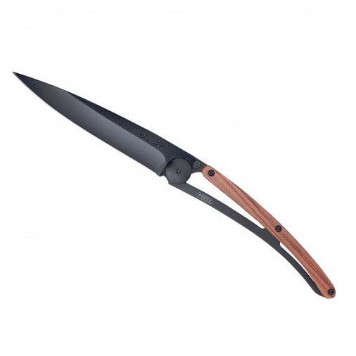 Ultralight and minimalist knives from the French brand Deejo are perfect for traveling, trekking, and hiking trips. They come in three sizes (15 g, 27 g, 37 g) and various designs. The Black 27g pocket knife features an 8 cm long blade in an elegant black color, a handle with coralwood exotic wood scales, a safety lock, and a clip for attachment.