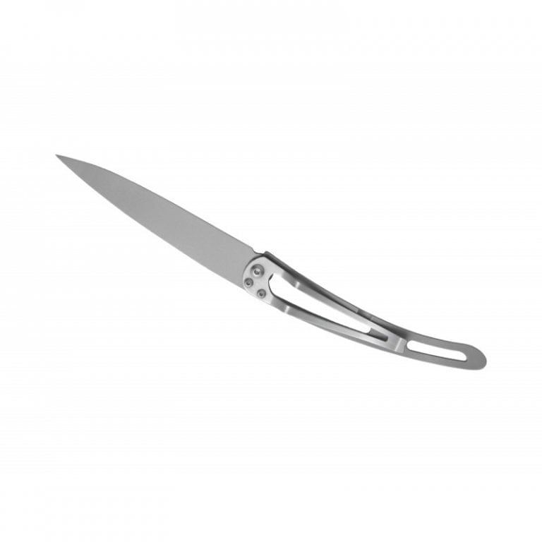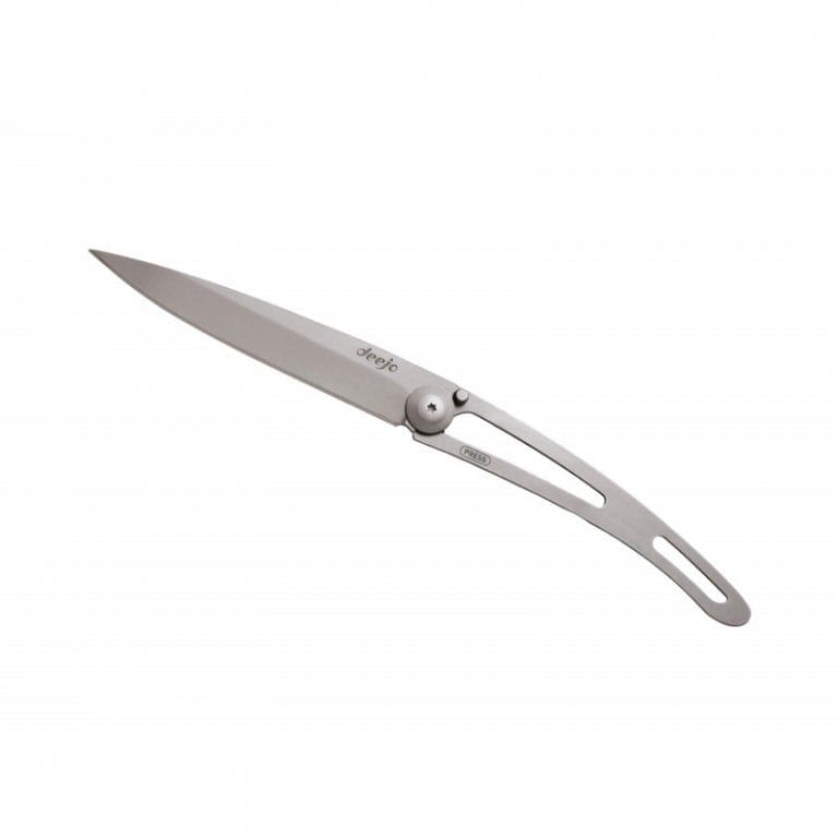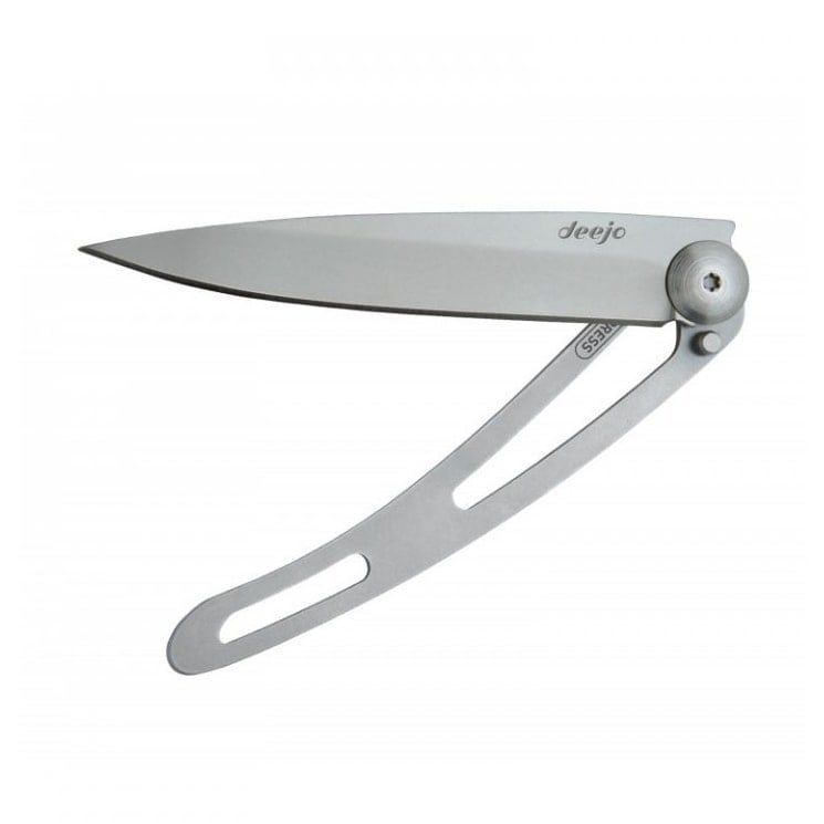 Ultralight and minimalist knives from the French brand Deejo are perfect for traveling, trekking, and hiking trips. They come in three sizes (15 g, 27 g, 37 g) and various designs. The Naked 37g is the largest version of the pocket knives and features an 9,5 cm long blade, handle, safety locking mechanism, and clip for attachment.