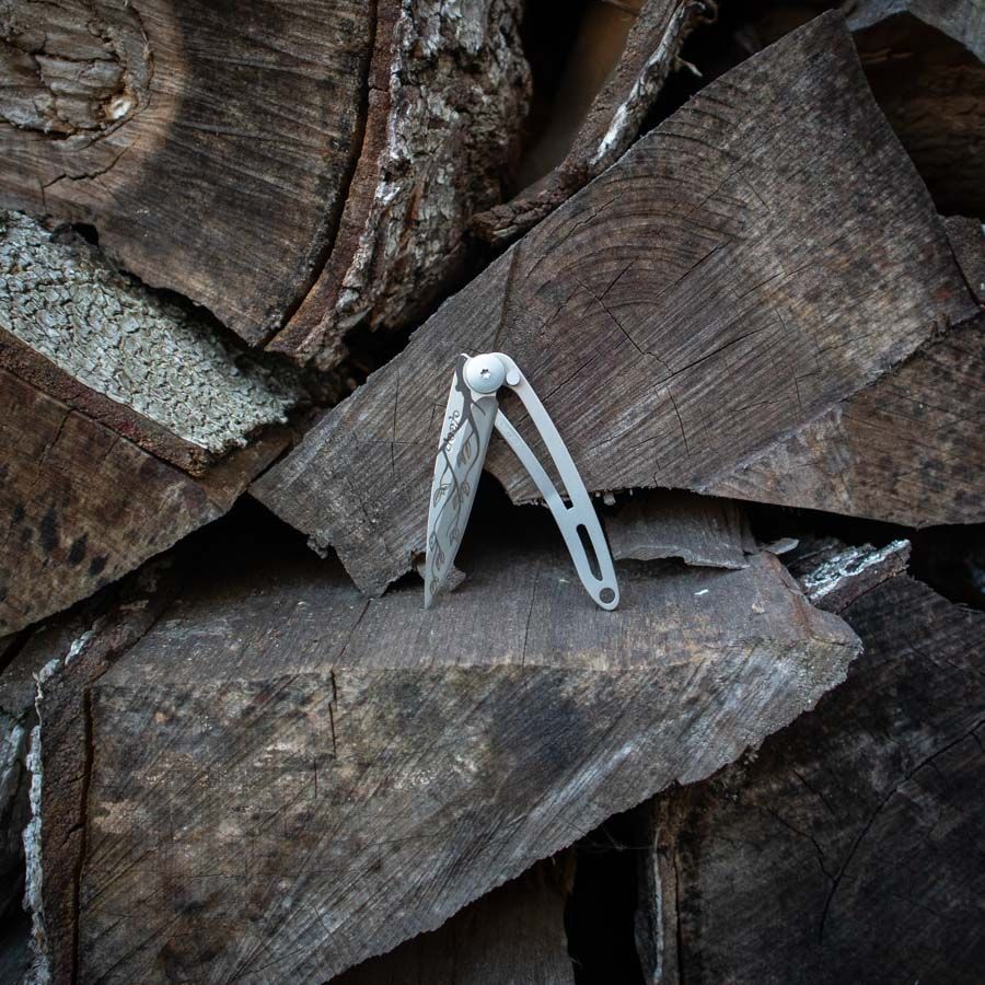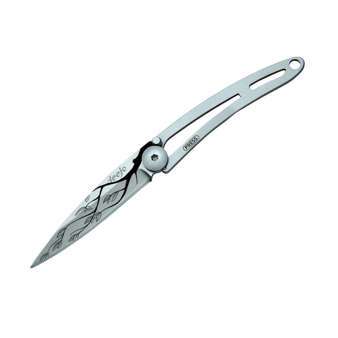 Ultralight and minimalist knives from the French brand Deejo are perfect for traveling, trekking, and hiking trips. They come in three sizes (15 g, 27 g, 37 g) and various designs. The Tattoo 15g Tree Naked version features a laser-engraved tree motif on the blade, consisting solely of a blade, handle, and safety locking mechanism.