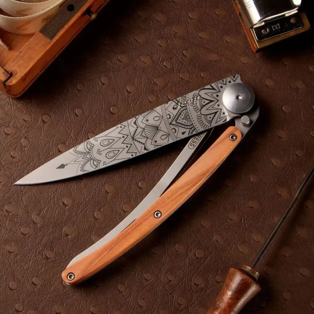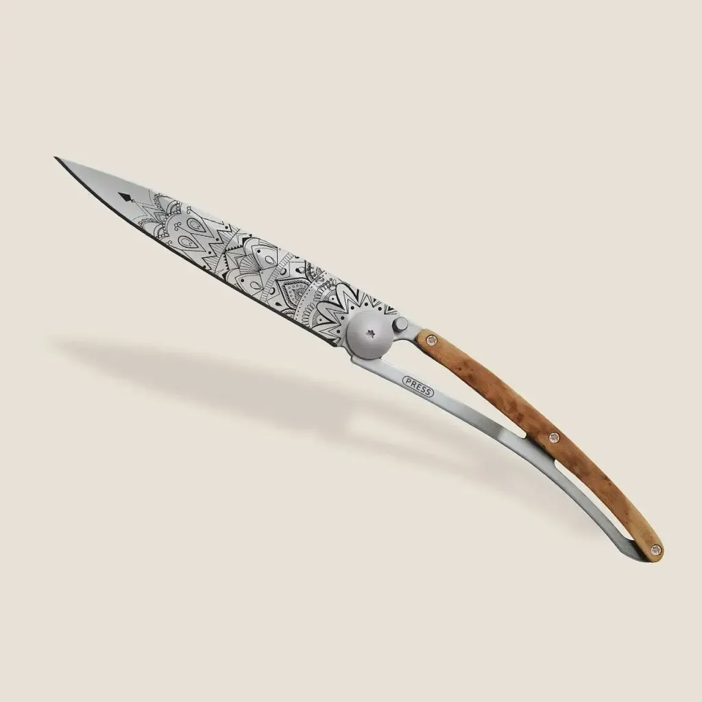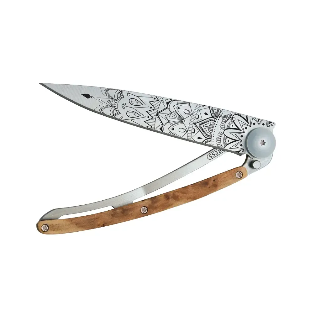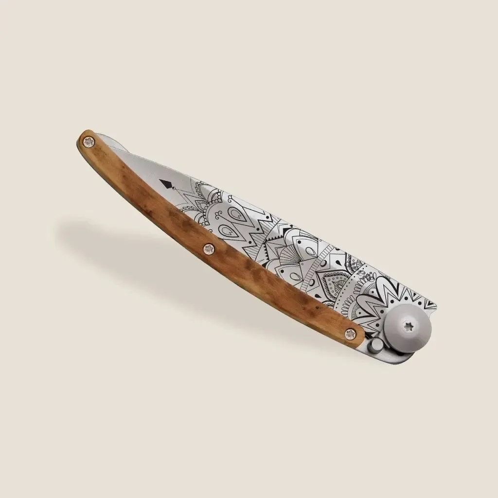 Ultralight and minimalist knives from the French brand Deejo are perfect for traveling, trekking, and hiking trips. They come in three sizes (15 g, 27 g, 37 g) and various designs. This knife features a laser-tattooed "Mandala" motif on a blade with a length of 9,5 cm, a handle with exotic juniper wood scales, a locking mechanism, and a clip for attachment.