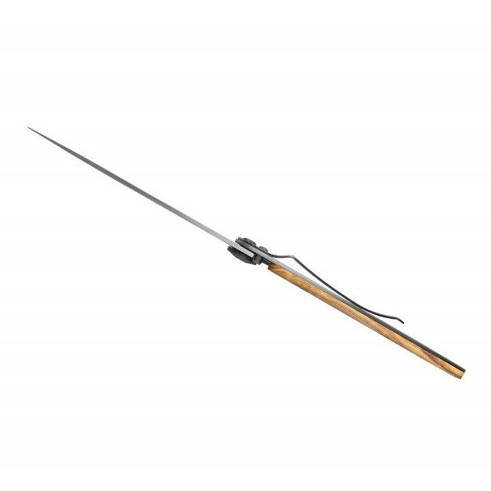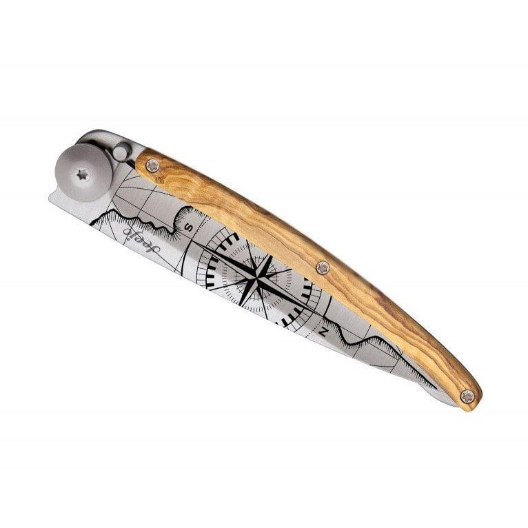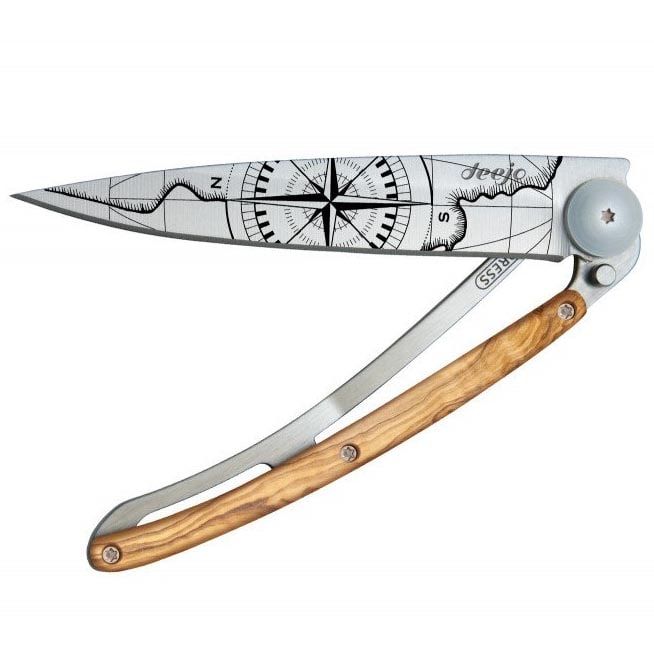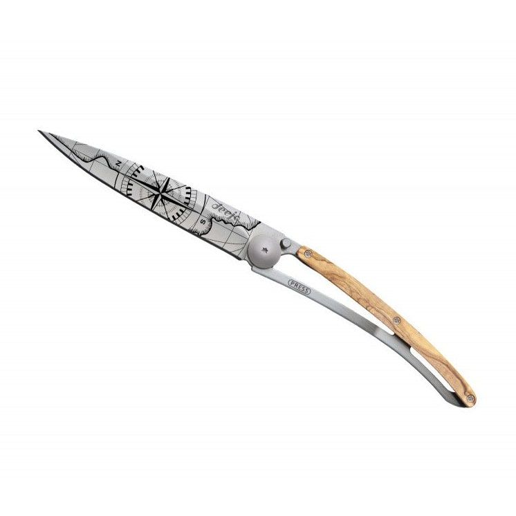 Ultralight and minimalist knives from the French brand Deejo are perfect for traveling, trekking, and hiking trips. They come in three sizes (15 g, 27 g, 37 g) and various designs. This knife stands out with a laser-engraved motif Terra Incognita ('Unknown Land'), a handle with olive wood scales, a 9,5 cm blade, a safety locking mechanism, and a clip for attachment.