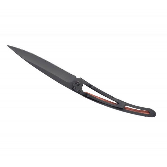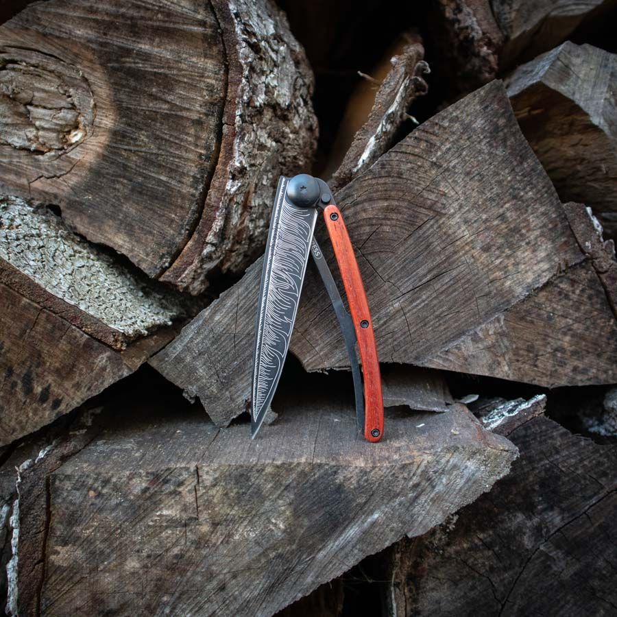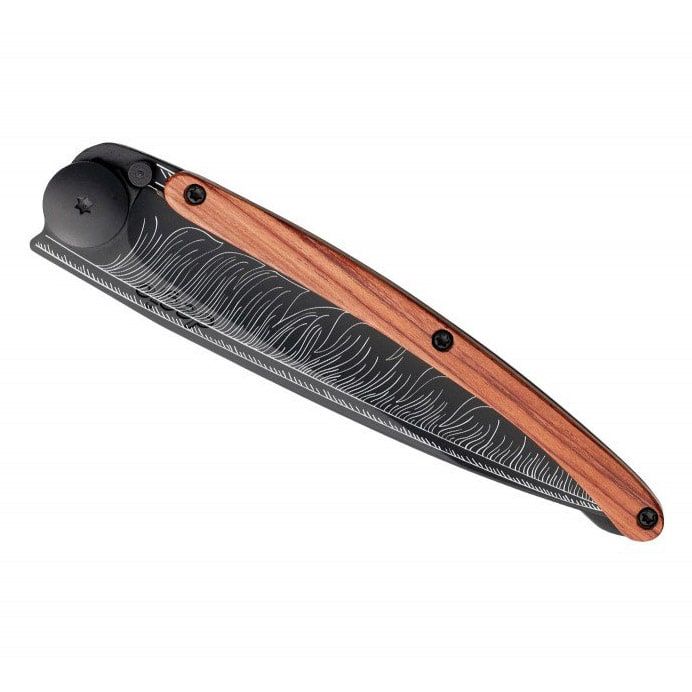 Ultralight and minimalist knives from the French brand Deejo are perfect for traveling, trekking, and hiking trips. They come in three sizes (15 g, 27 g, 37 g) and various designs. This stylish knife stands out with a laser-engraved feather motif, a handle with coralwood exotic wood scales and a black blade.
