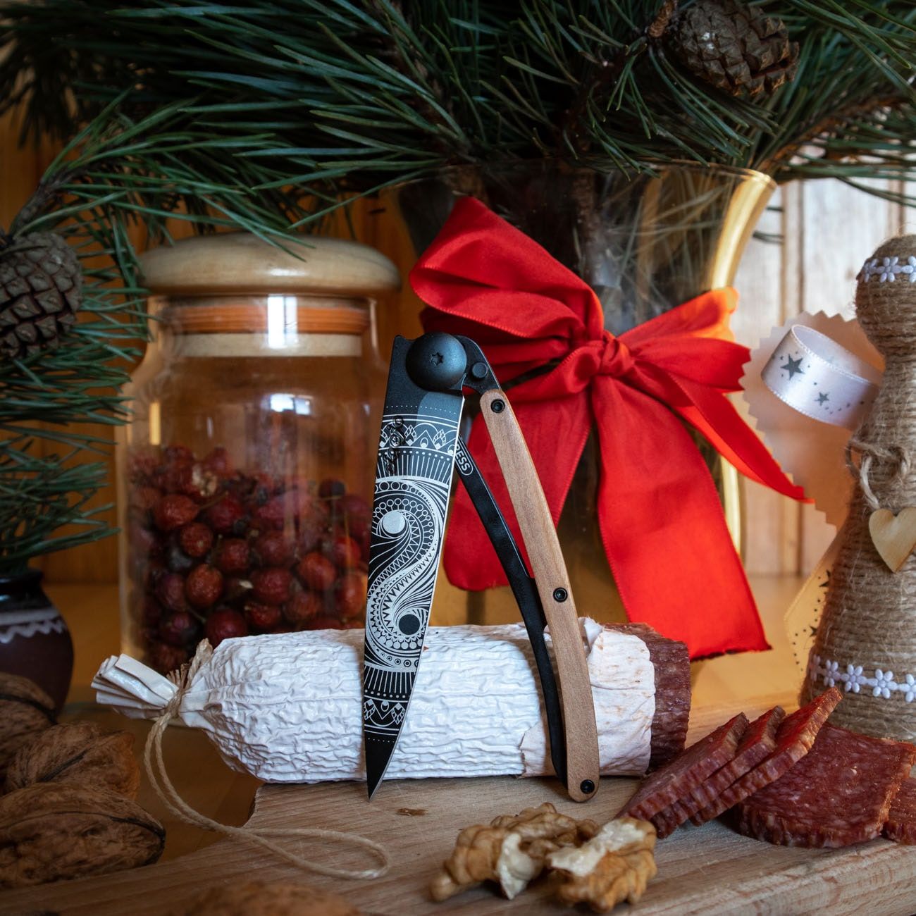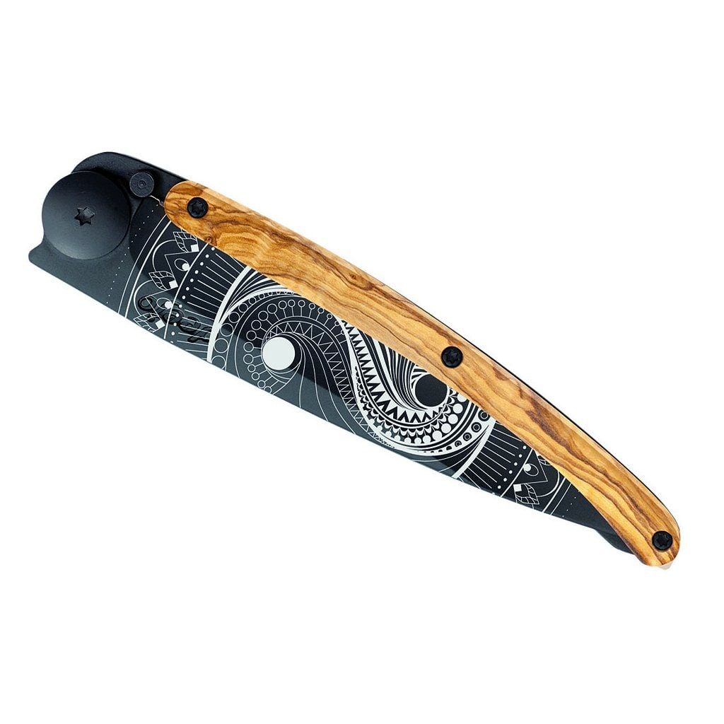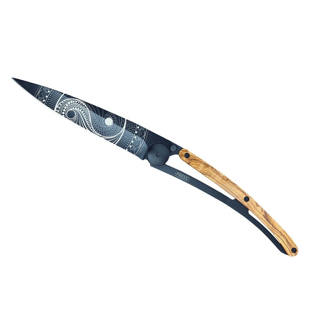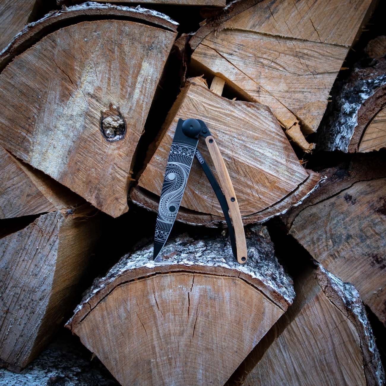 Ultralight and minimalist knives from the French brand Deejo are perfect for traveling, trekking, and hiking trips. They come in three sizes (15 g, 27 g, 37 g) and various designs. This stylish knife stands out with a laser-engraved Yin Yang motif, a 9,5 cm long black blade, and a handle with olive wood scales.