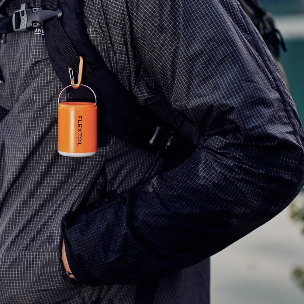 The TINY Pump 2X is a compact waterproof outdoor air pump that measures 4,6 x 4,3 x 5,8 cm and weighs only 96 g. It fits in the palm of your hand and can be packed into any pocket of your backpack, so you always have an air pump, vacuum pump, and camping light all in one at hand.
