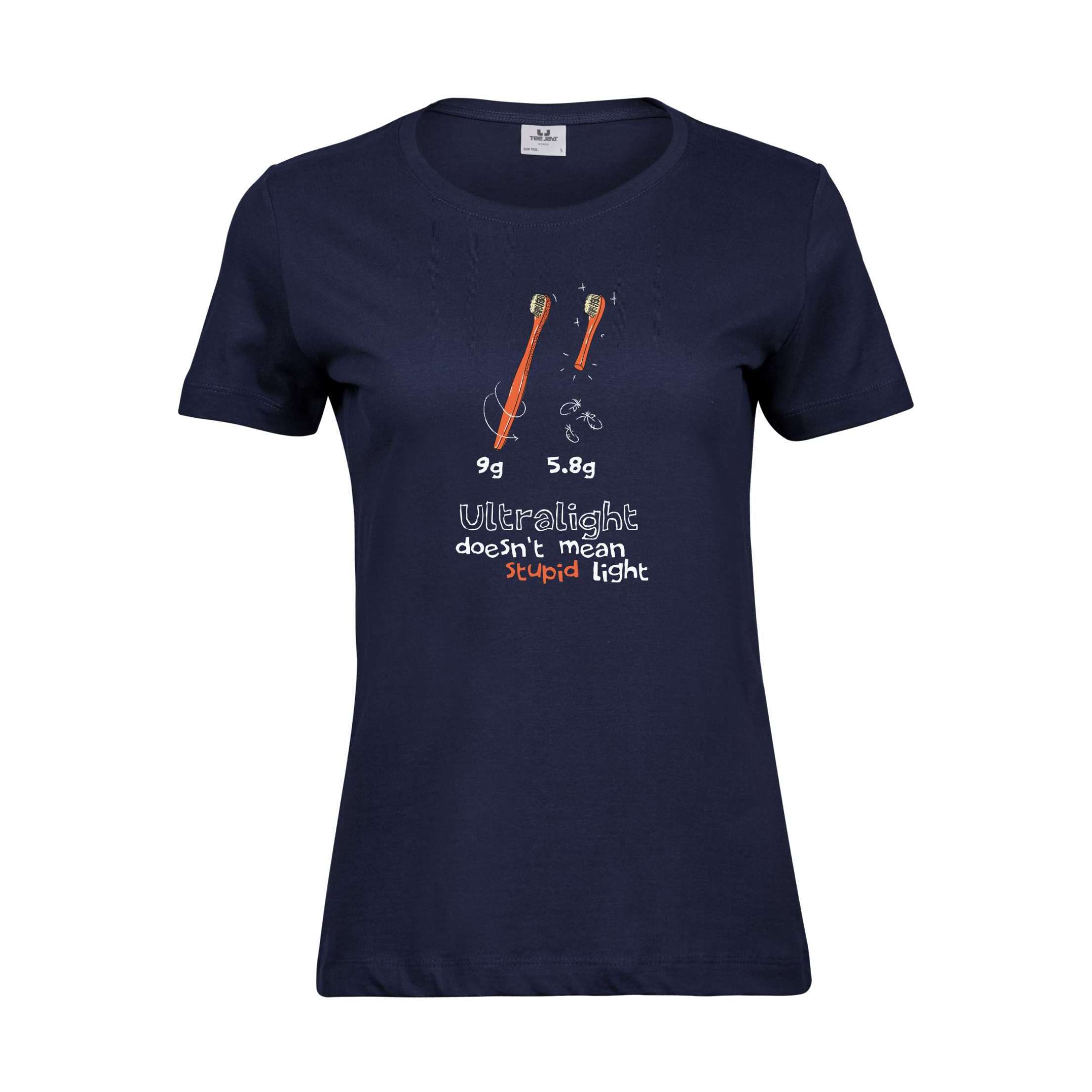A high-quality and comfortable women's cotton t-shirt featuring a design that highlights the differences between Ultralight and Stupid Light. This t-shirt will bring you joy during everyday wear whether you're heading to work, shopping in the city, or grabbing a beer with friends.