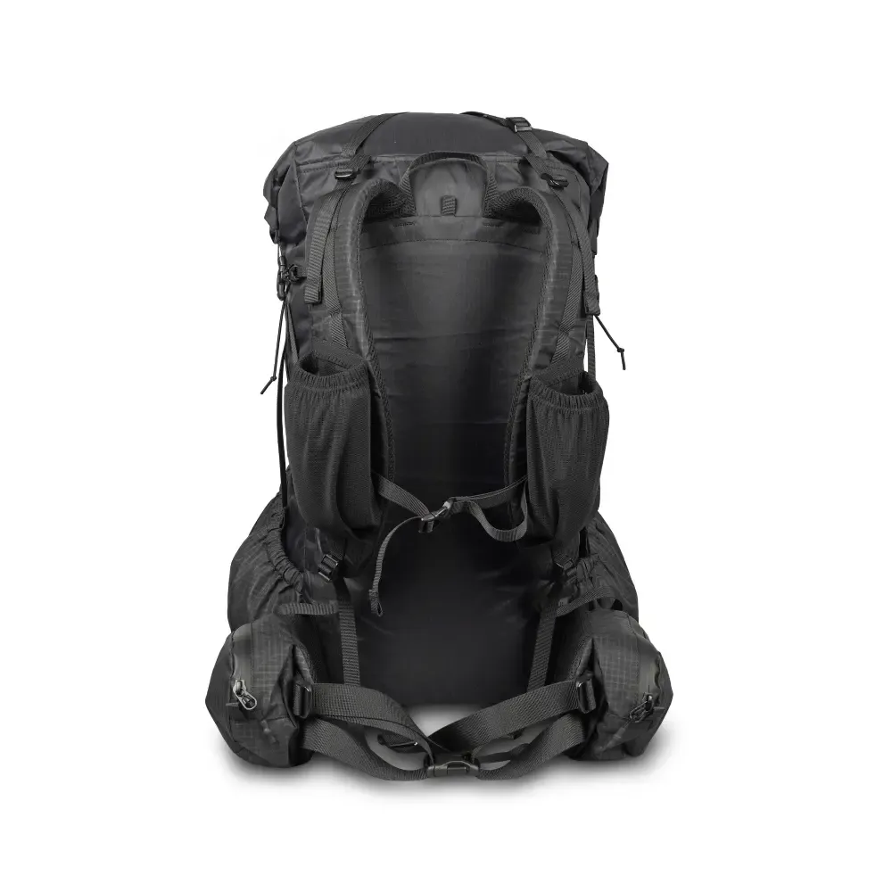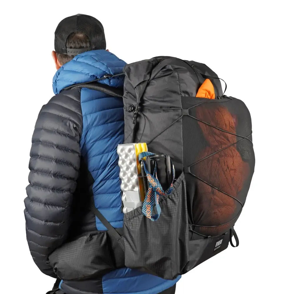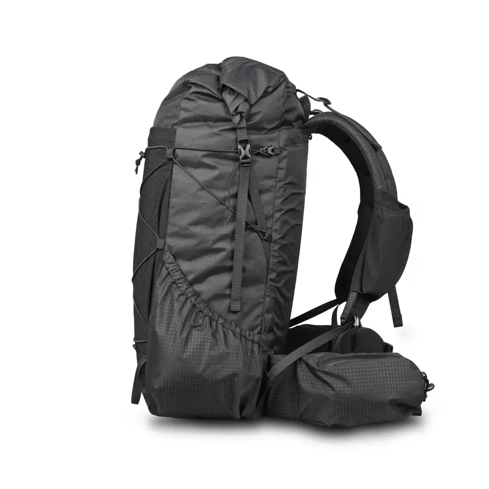 The backpack is constructed from X-Pac® VX07S material. The side pockets, hip belt pockets, and upper side of the shoulder straps are made from UltraGrid™ (recycled 210D nylon x 5 mm double 200D) with a DWR coating. Stretch pockets are made from durable spandex/nylon.