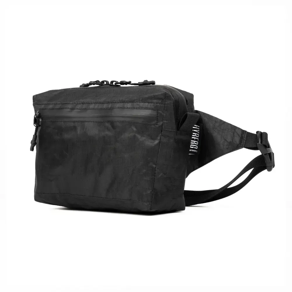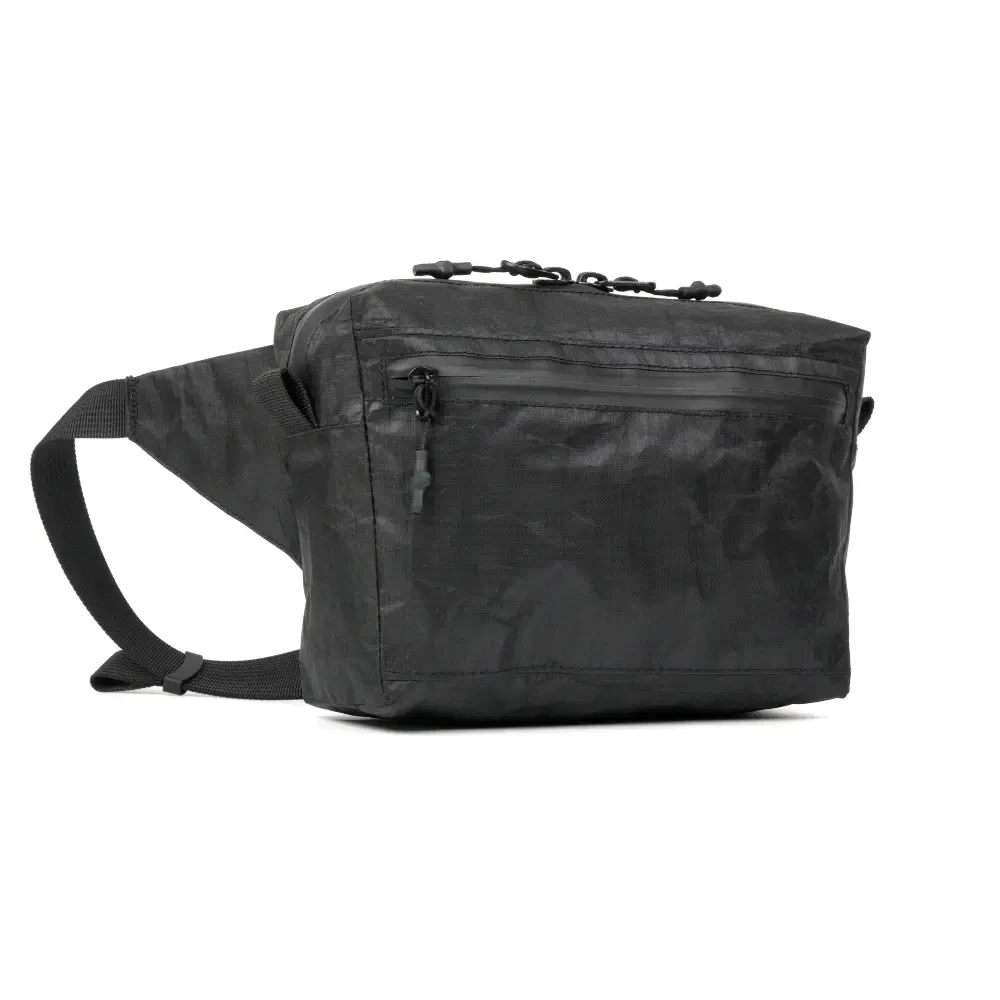 Ultra material falls among the ultralight and extremely durable fabrics specially developed for demanding use in the outdoor industry. Similar to Dyneema®, it's made from UHMWPE (ultra-high-molecular-weight polyethylene) fibers, but it has a different lamination construction and weaving structure. The fanny pack is made from Ultra 100X material (100D UHMWPE ripstop laminated onto recycled polyester film). The result is a lightweight, water-resistant, and exceptionally strong material with high abrasion and tear resistance.