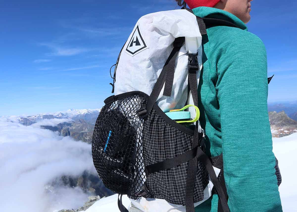 External pockets: The side pockets are made from a very durable strong material, Hardline with Dyneema®, which allows the backpack to withstand pushing through narrow overgrown trails. The large front pocket is made from sturdy mesh with an elastic rim, so you can easily dry wet gear in it and water simply drains away in the rain.