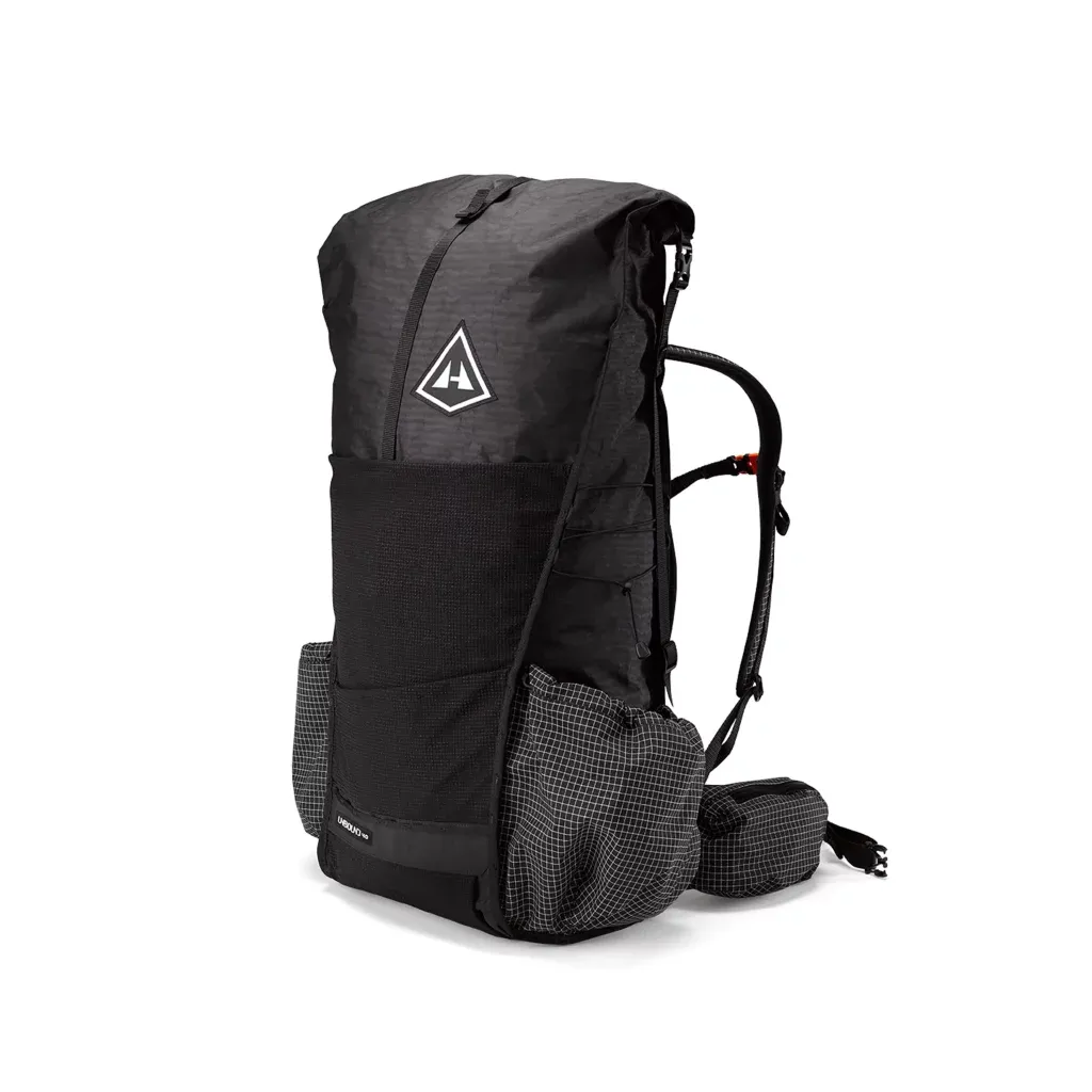The HMG Unbound 40 backpack in white is constructed from hybrid composite Dyneema® fabric—Dyneema® Composite Hybrid 3.8 (120 g/m², DCH50) and Dyneema® Composite Hybrid 5.1 (170 g/m², DCH150) on the bottom and back panel. The HMG Unbound 40 backpack in black is fully constructed from the more durable Dyneema® material—Dyneema® Composite Hybrid 5.1 (170 g/m², DCH150).