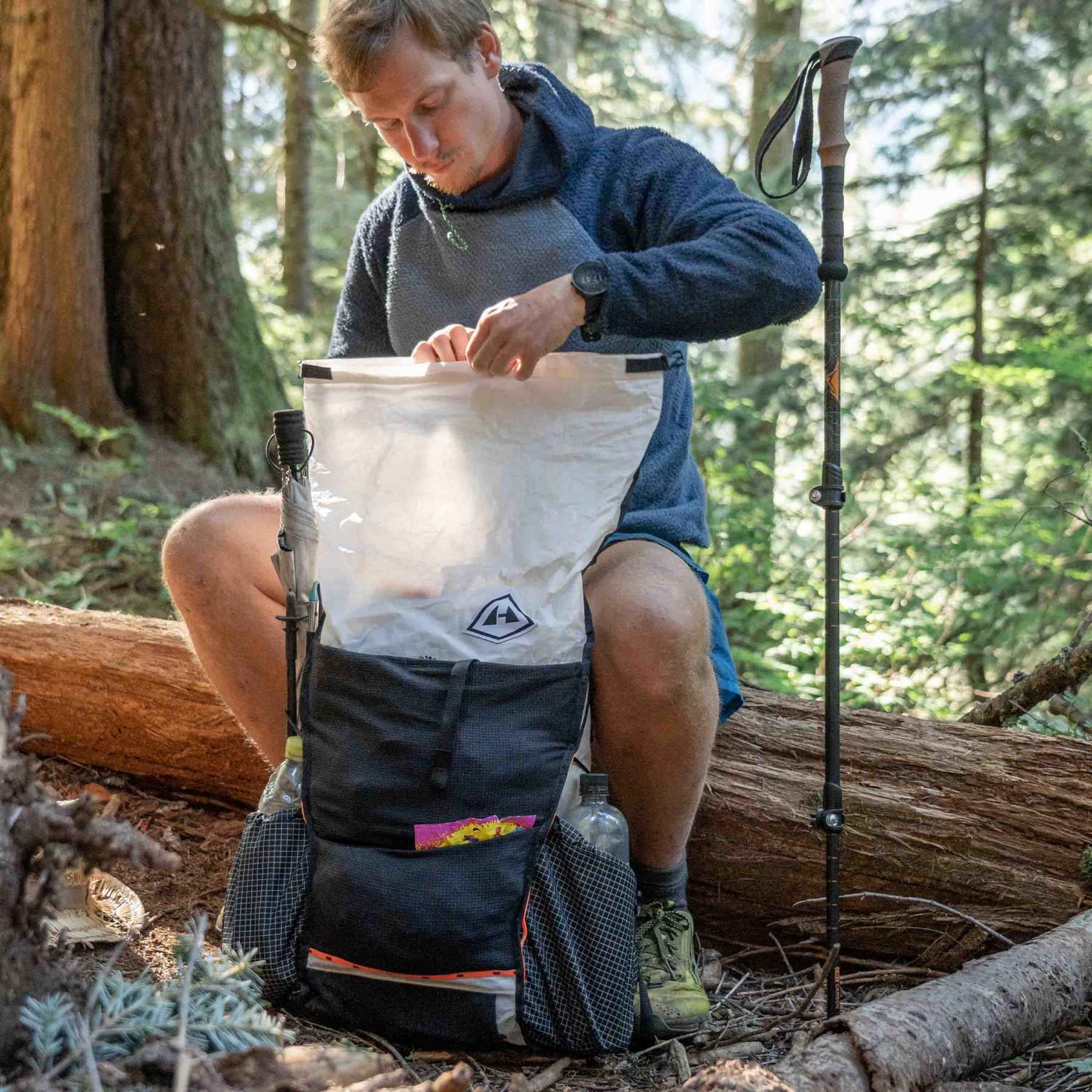 Bottom (trash) pocket: The bottom stretch pocket is made from durable Dyneema® Stretch Mesh material and is ideal for easy access to snacks, a waterproof jacket, or trash.