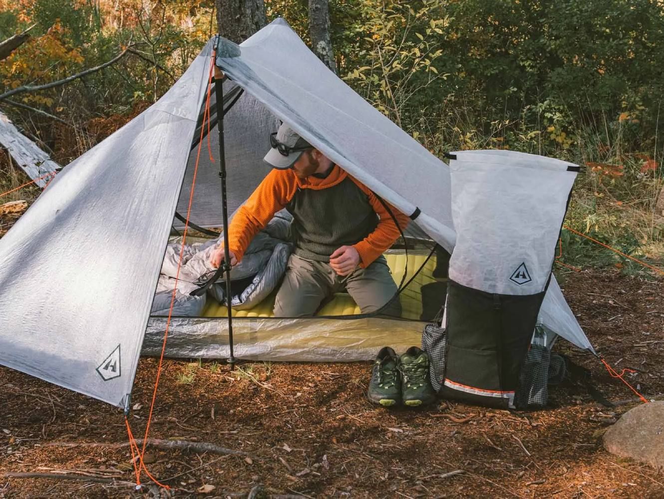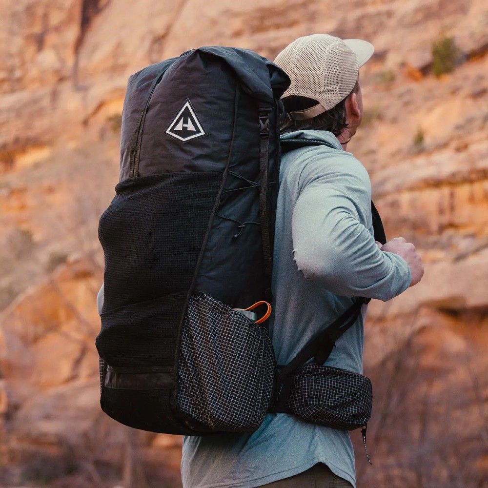 The HMG Unbound 55 backpack in white is constructed from hybrid composite Dyneema® fabric—Dyneema® Composite Hybrid 3.8 (120 g/m², DCH50) and Dyneema® Composite Hybrid 5.1 (170 g/m², DCH150) on the bottom and back panel. The HMG Unbound 40 backpack in black is fully constructed from the more durable Dyneema® material—Dyneema® Composite Hybrid 5.1 (170 g/m², DCH150).