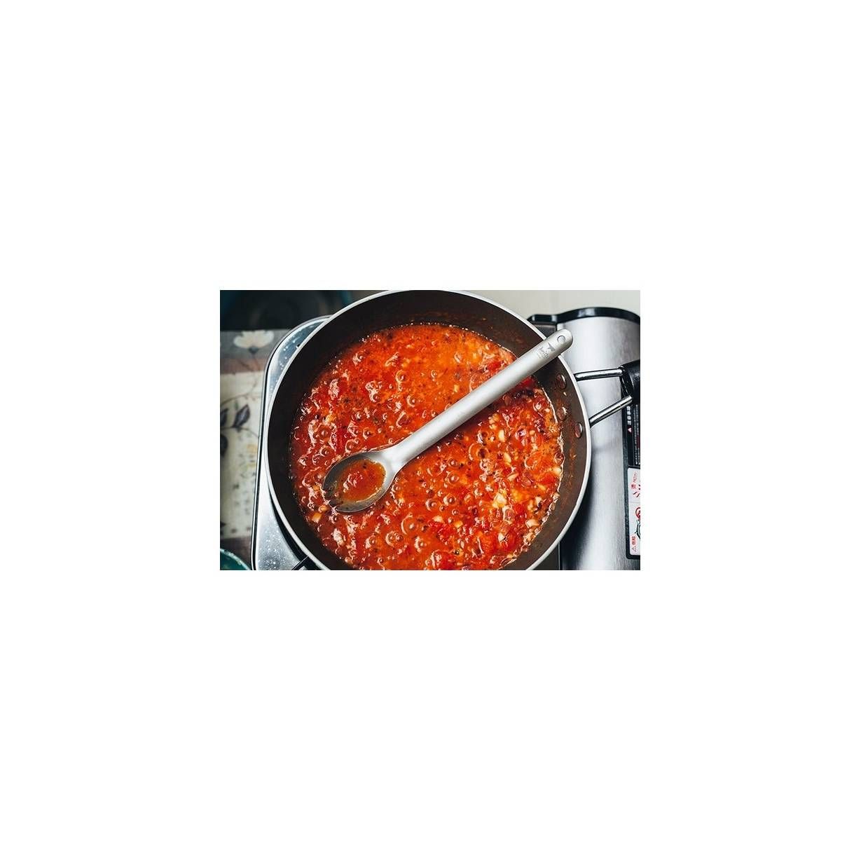 Long serrated spoon (spork) made of brushed titanium. It is perfect for eating directly from the pouches of dehydrated meals or deep pots. Its length is 22 cm. A storage sack is included with the spoon.