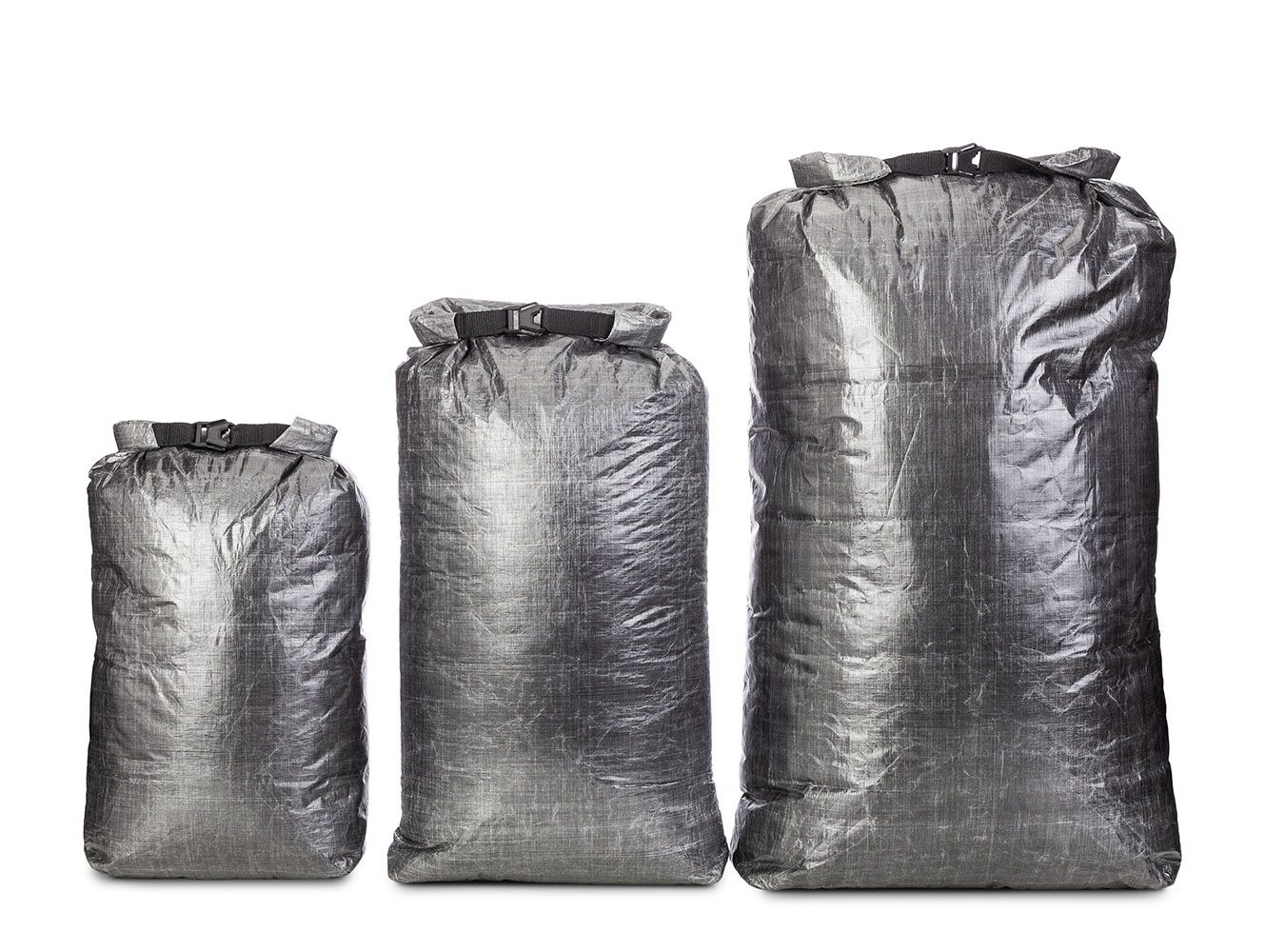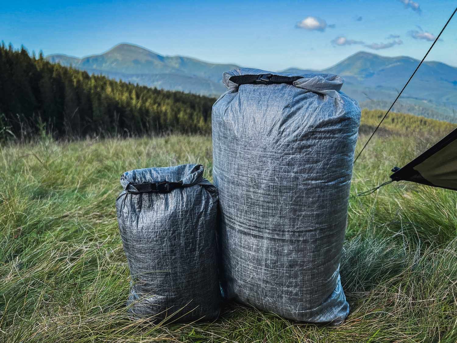 The stuff sack are made from the composite fabric Dyneema® (weight 48,4 g/m2), which is created by fusing and laminating additional layers with Dyneema® fibers. This material excels in high abrasion resistance, exceptional strength, outstanding rip-stop properties, and impermeability to moisture.