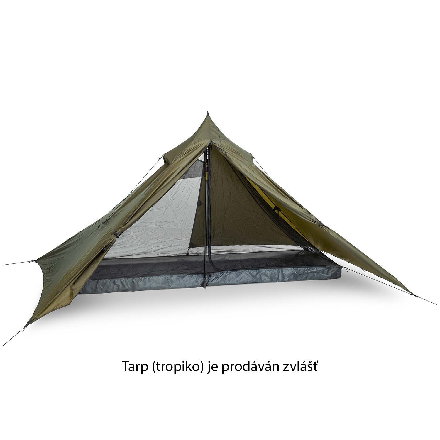 A mosquito net (inner tent) that greatly enhances your sleeping experience in the Pyraomm Duo Tarp. Designed for one person, it features a single entrance. To maximize the durability of the floor, we recommend placing it on Tyvek. When you assemble the full setup (stakes, tarp, mosquito net), you achieve an impressive weight of approximately 800 grams, making it a lightweight full double-wall tent for one person with plenty of storage space.