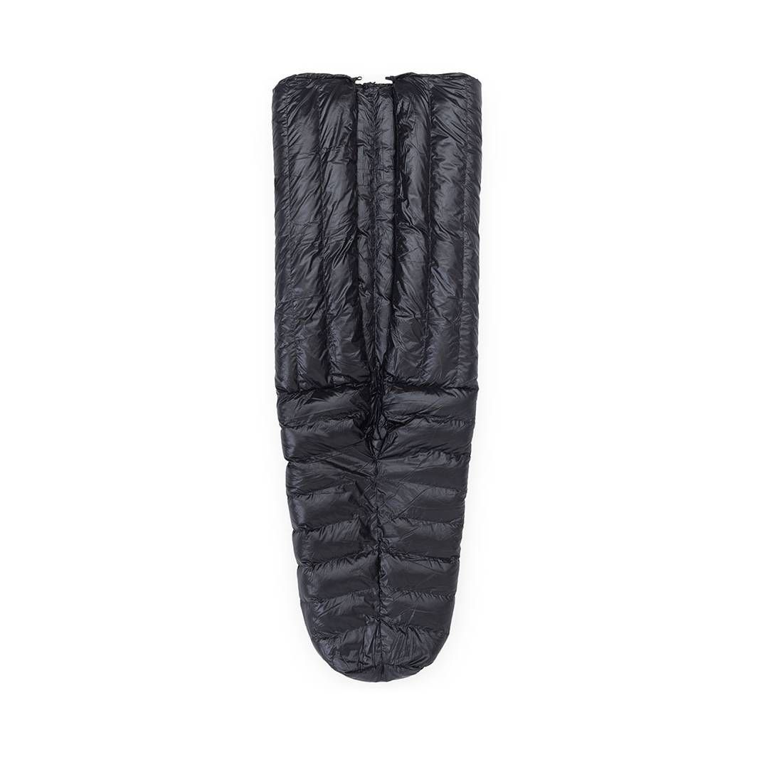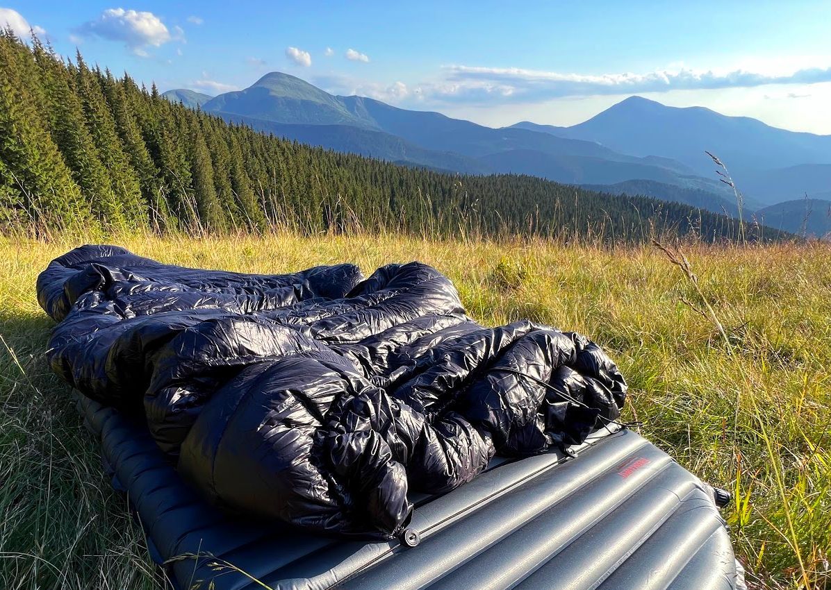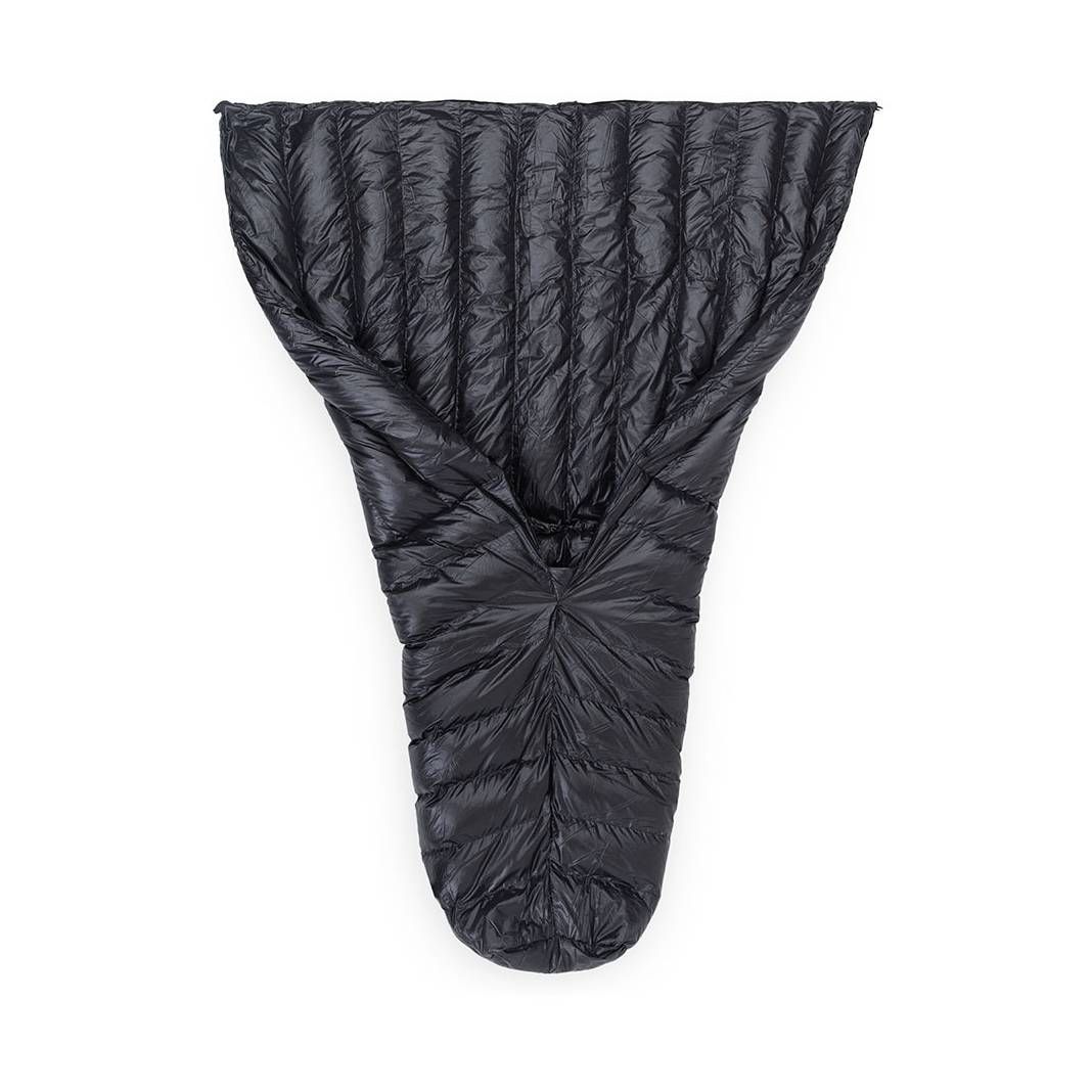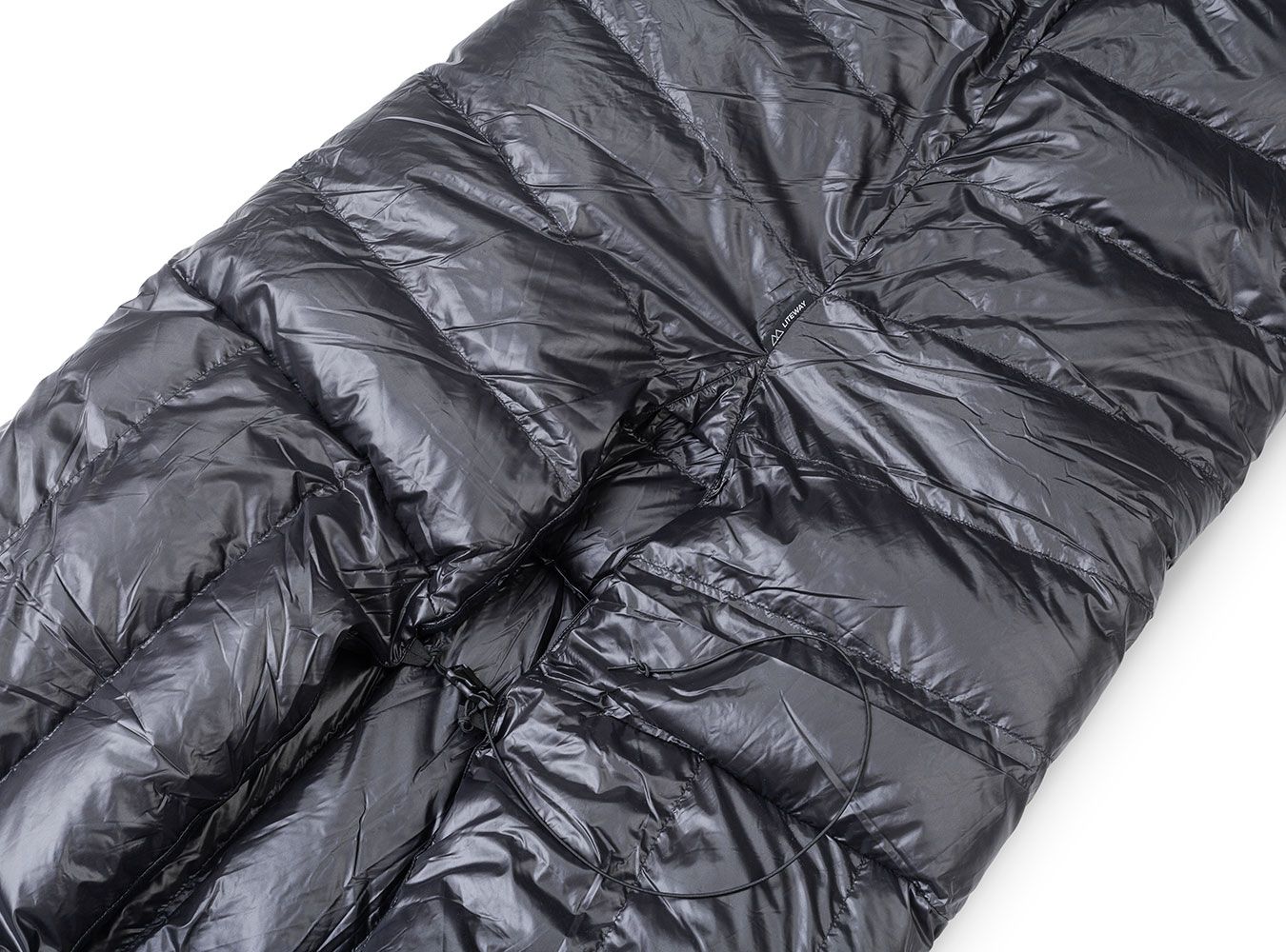 To save weight and improve packability, quilts are stripped of all unnecessary features. On its back side from the waist up, inefficiently used down is removed, which would be mostly compressed under your body and practically serve no purpose. To keep the opening on your back underneath you at all times, the quilt is attached to the sleeping pad using elastic straps. The quilt remains in a fixed position, and you can turn inside it. The quilt can be used with any type of sleeping pad (inflatable or foam). Additionally, the quilt does not have a hood; you can replace it with a hat or a hooded down jacket/sweatshirt.