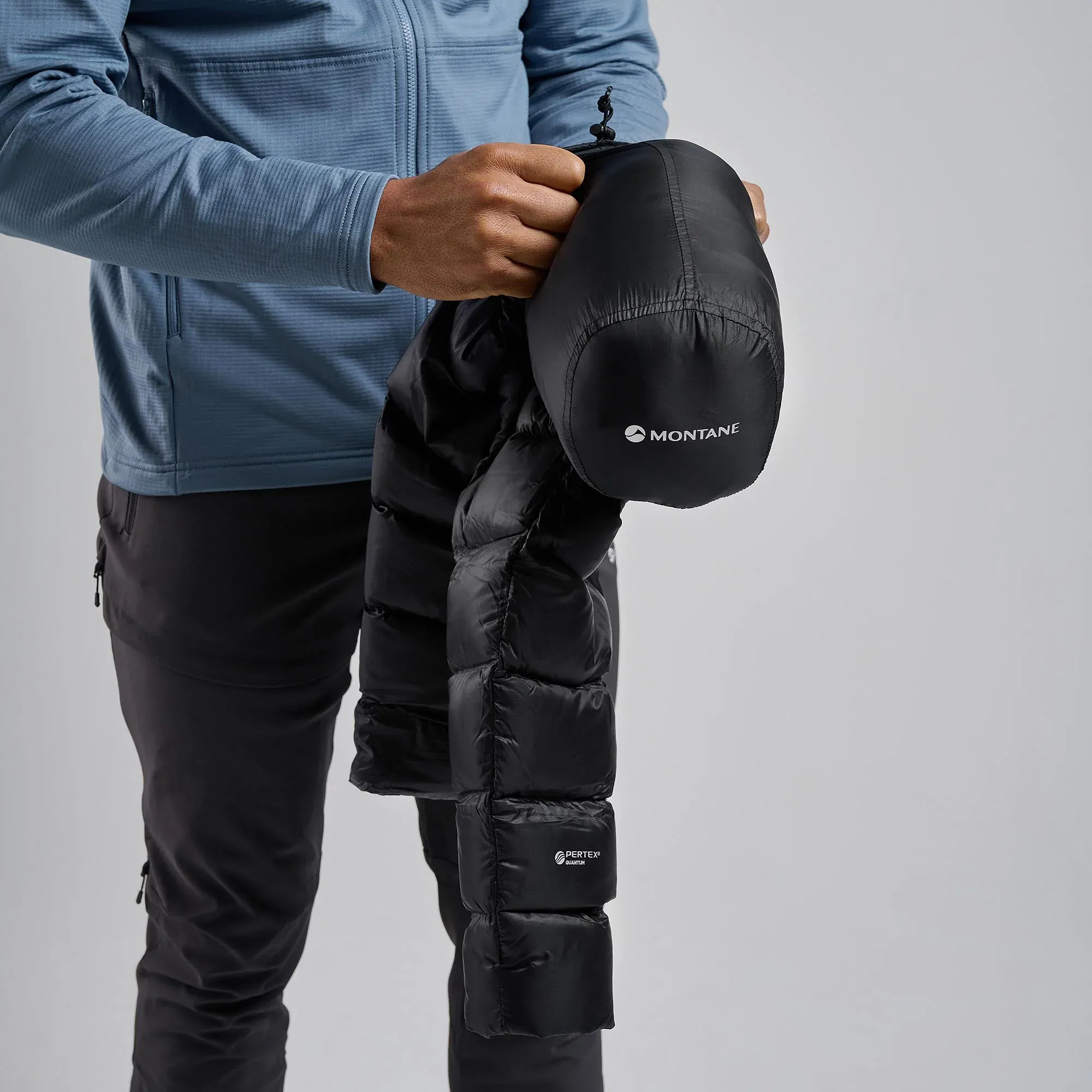 The Montane Anti-Freeze XT Hoodie is a men's down jacket with a hood, made from ultralight recycled materials and it's highly packable. It is filled with high-quality duck down 750+ cuin. It is a warmer version of the Anti-Freeze Hoodie, with a higher down weight (210 g) and a wider chamber construction for greater loft. The ideal companion for all winter adventures!