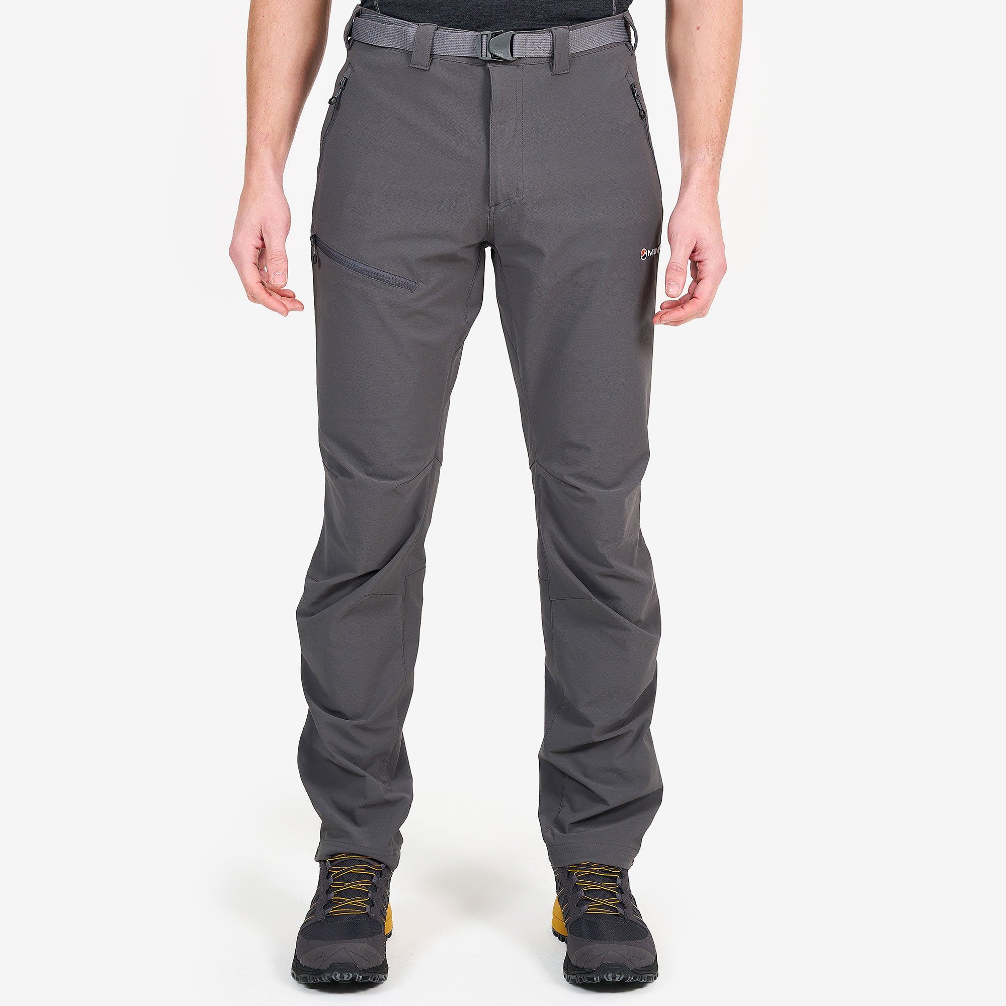 Montane Terra Route Pants are durable softshell pants for cooler conditions suitable for trekking and mountaineering. They are constructed from flexible, quick-drying, and windproof Granite Stretch material with a water-repellent DWR treatment. The pants have adjustable lower leg openings and several other features.