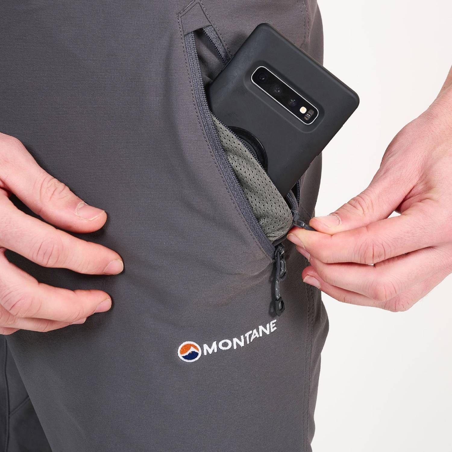 The Terra Route pants are quite rich in pockets. Classically, you'll find two YKK zip pockets with internal mesh on the sides. In the left pocket, there is an additional hidden pocket for valuables. On the right thigh, there is another zip pocket.