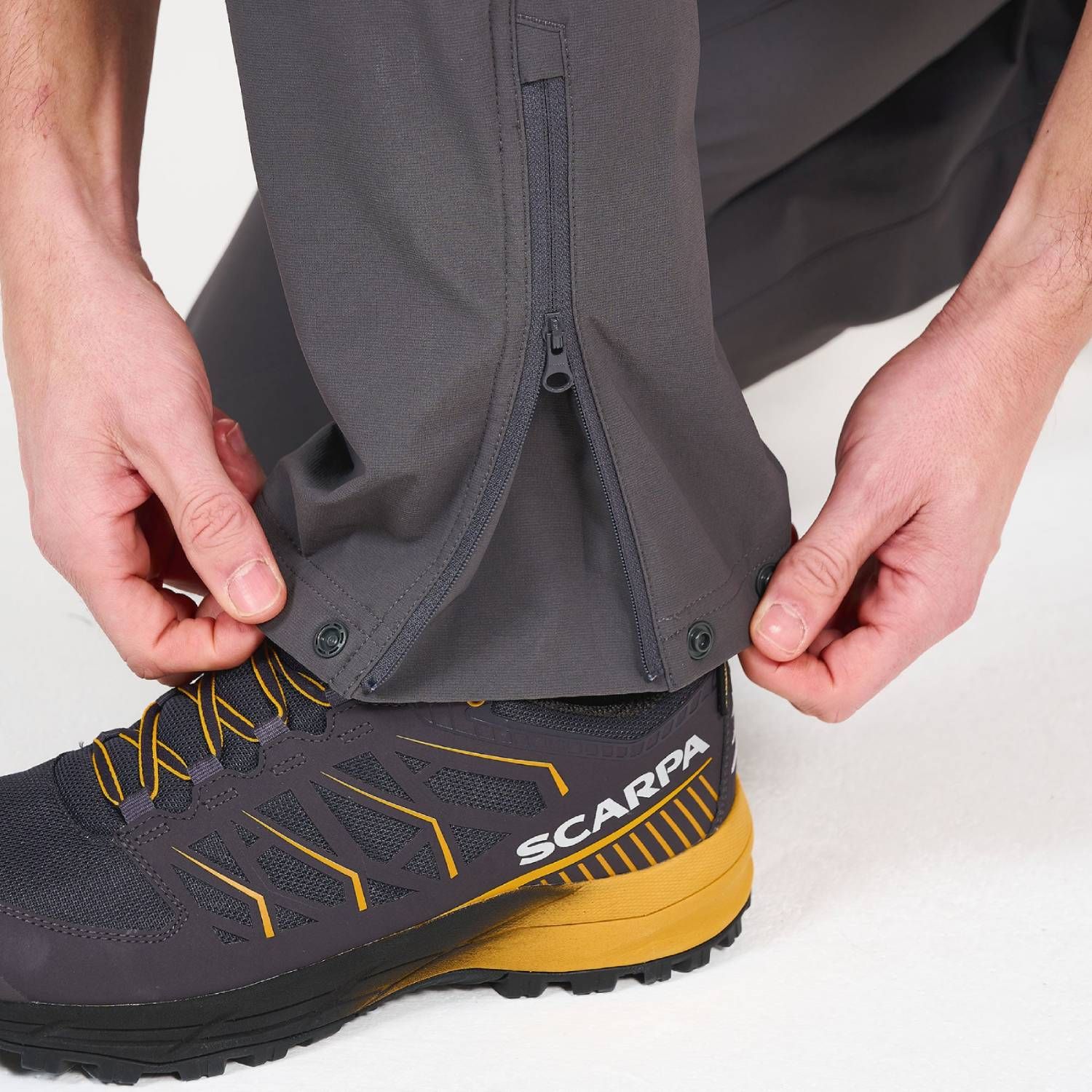Using snaps and a zipper, you can adjust the width of the lower pant legs and their edges.