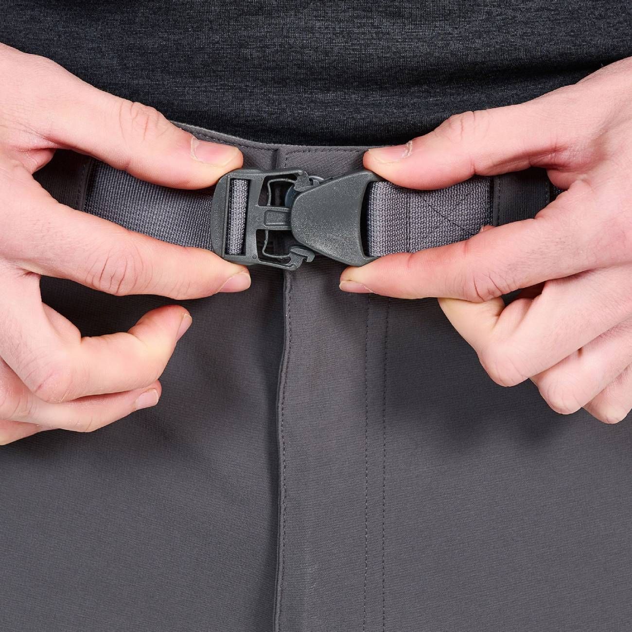 Elastic waistband with pleasant microfleece. The pants include a removable belt with a flat buckle.