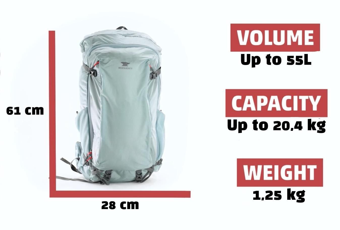 The total volume of the backpack is 55 liters, with a manufacturer-rated maximum load capacity of 20,4 kg.