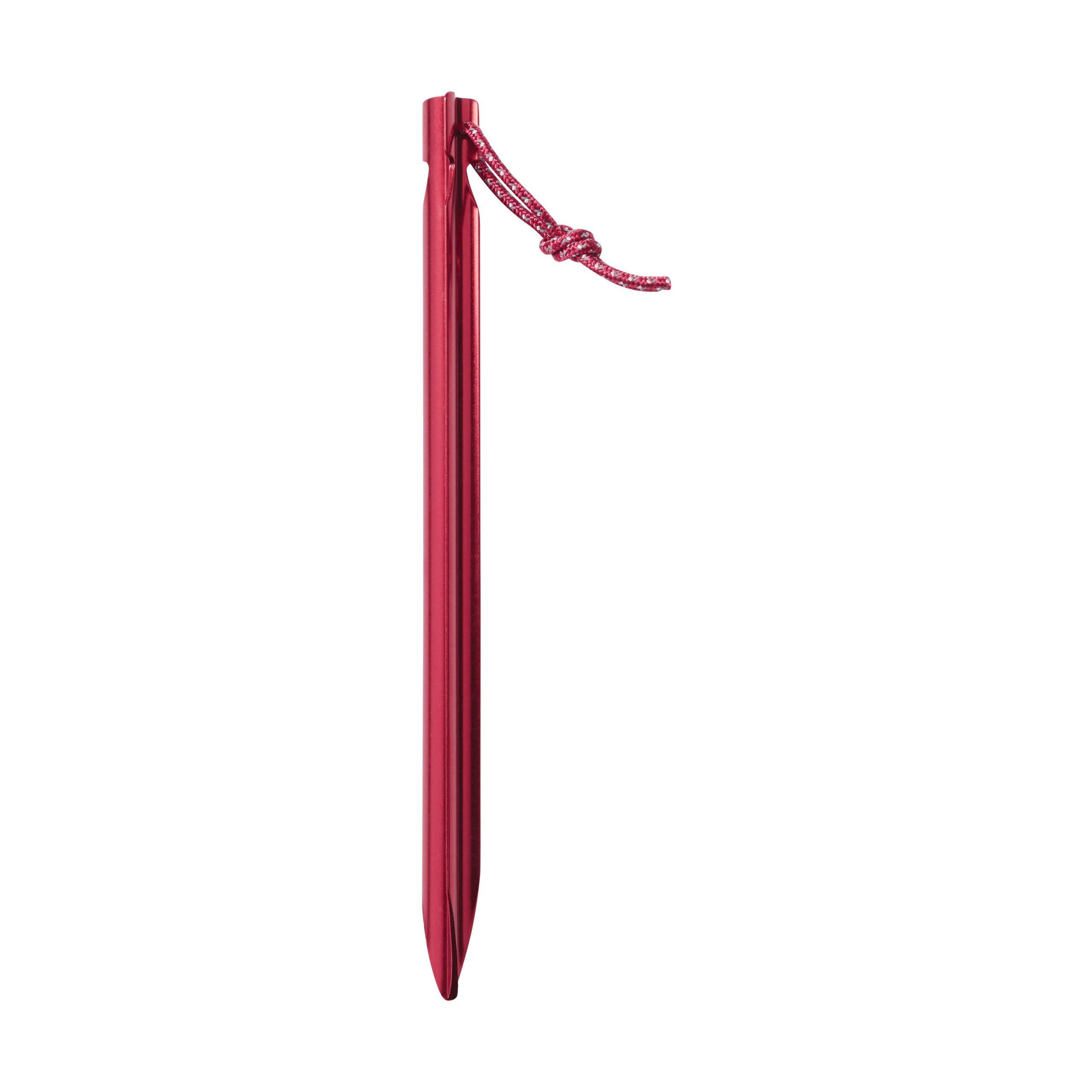 The weight of one stake is 13 grams and its length is 19 cm. The stakes are constructed from ultralight yet durable 7075 aluminum alloy. For better visibility and corrosion resistance, the stakes are coated with red anodized finish. The reflective pull loop allows for easy removal. The stakes are sold in a set of 6 pieces.